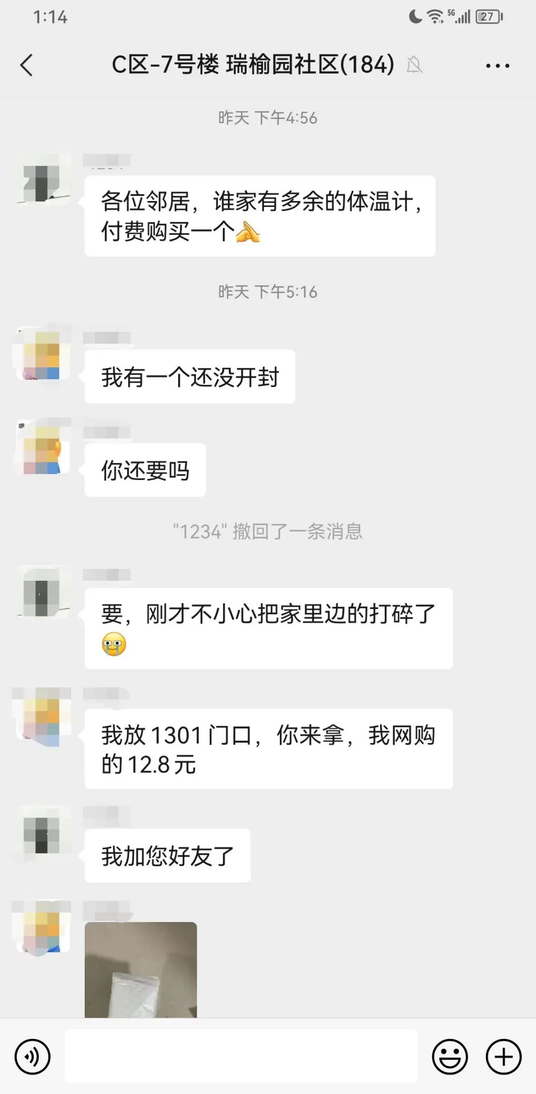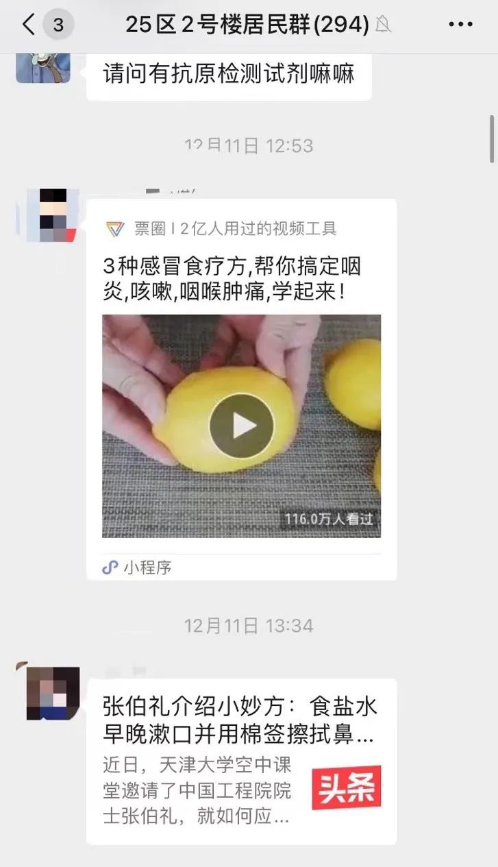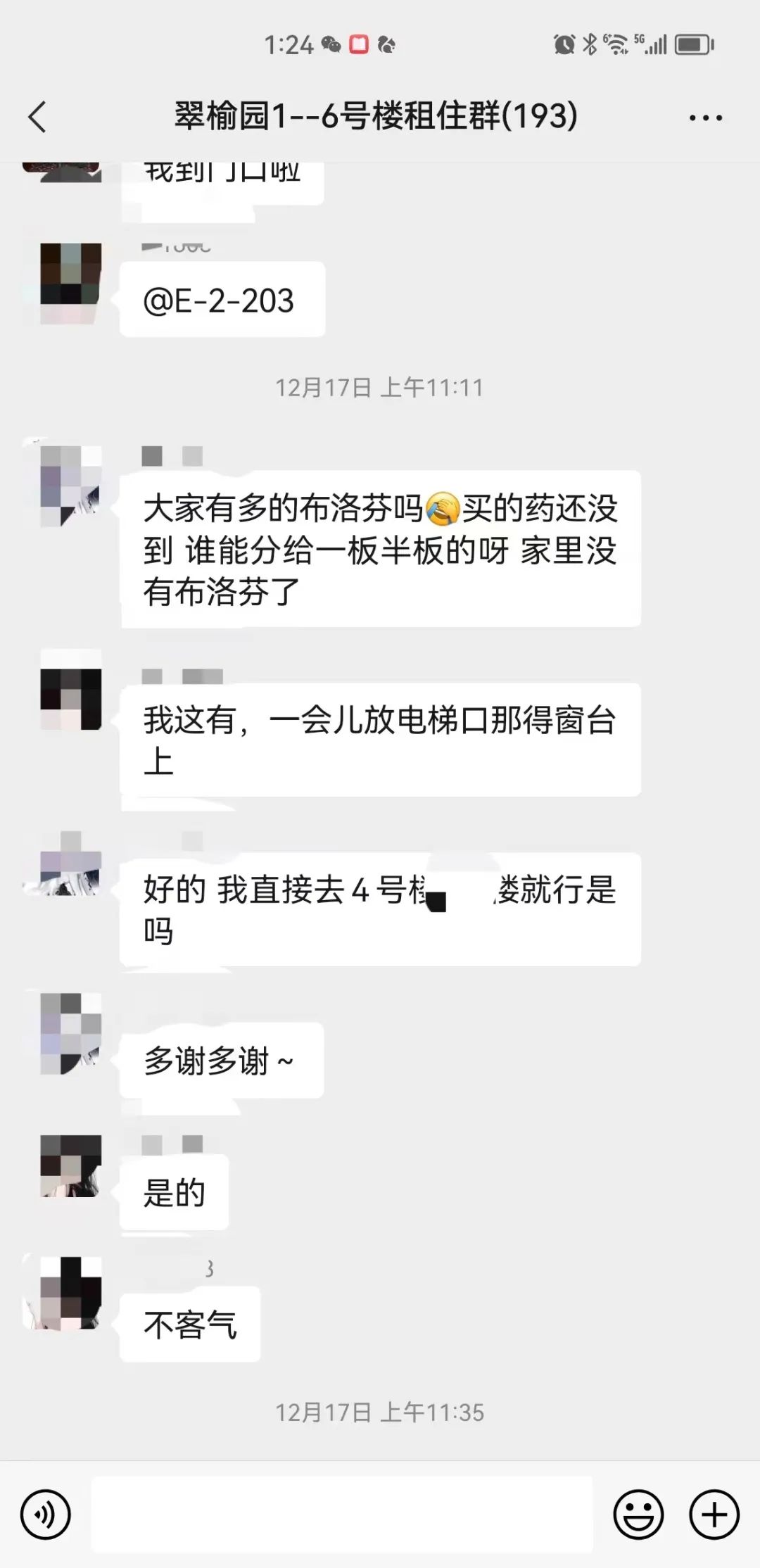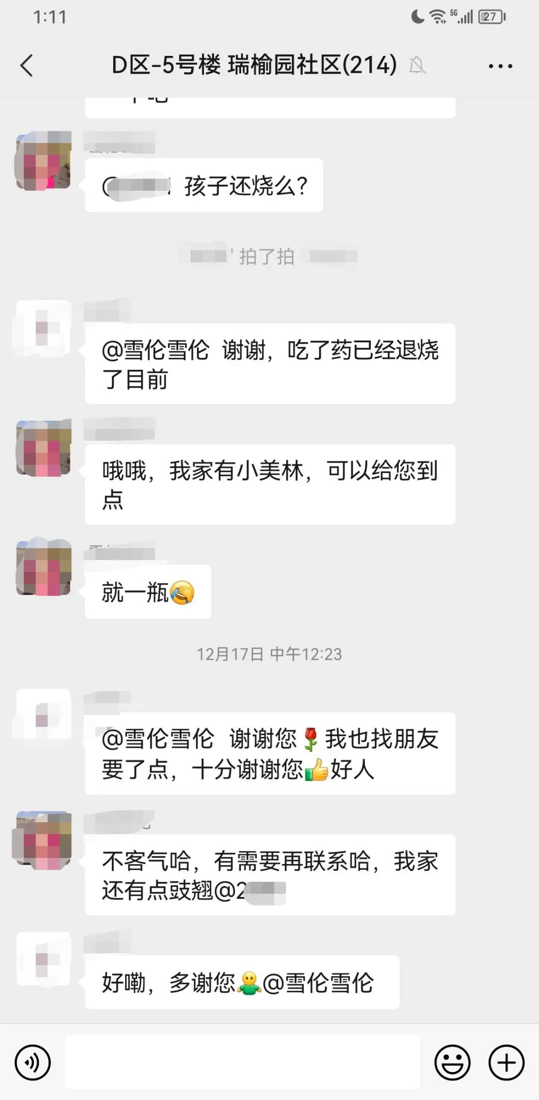“不好意思求助大家,我爱人现在孕晚期,请问谁家有泰诺林?”“谁家有孩子吃的退烧药?”……声声求助换来的是暖心救急,“放家门口了”、“我私信您地址”……没有明码标价,没有计较得失,在各社区微信群中,大家“零接触式”分享家中富余的药品,防护意识也是十分到位,在冬日里讲述着一个个“众人拾柴火焰高”的暖心故事。