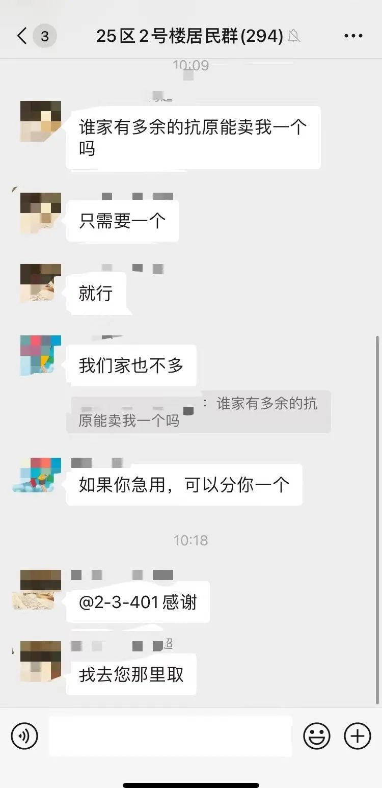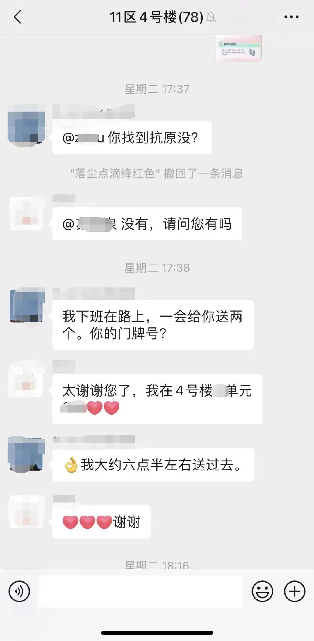楼上居民在群里发信息说急需抗原,楼下邻居立刻拿出家中备用进行分享;有居民问小区附近哪有温度计可以购买,看到消息的邻居马上回复“送您一支”......社区工作人员表示,类似邻里互助,爱心接力的暖心事还有很多。“战胜病毒的不止药物,更有居民们一颗颗互助的心,小小的网格群在这个时候发挥了大作用,织起了邻里互助网,筑起了防疫坚实墙!”