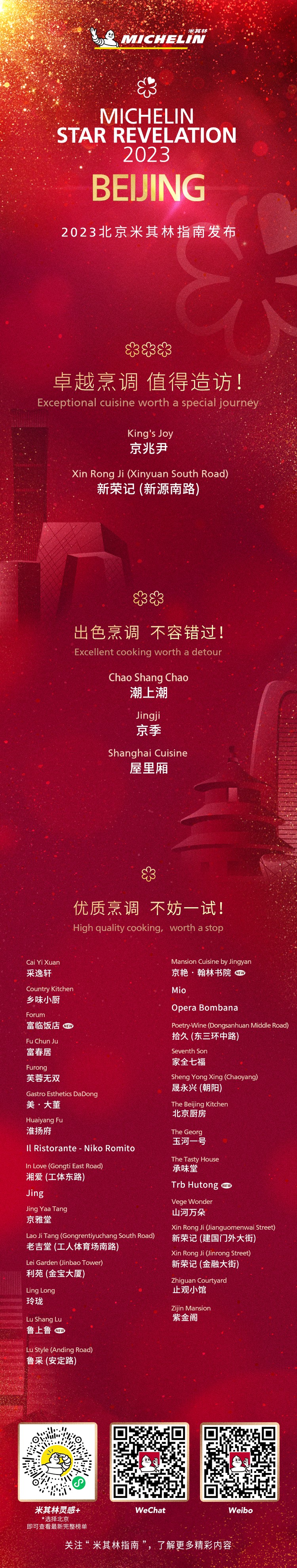 12月21日,2023北京米其林指南榜单正式发布。新版榜单共收录108家餐厅,包括2家三星餐厅、3家二星餐厅、31家一星餐厅,以及19家必比登推介餐厅和53家米其林指南入选餐厅。此外,米其林指南侍酒师奖也首次在北京颁出。