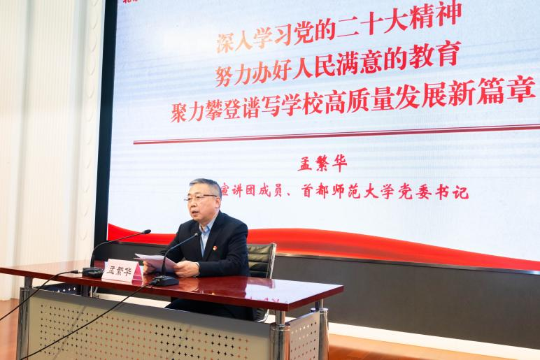 11月11日,学校成立首都师范大学学习贯彻党的二十大精神宣讲团,下设教师宣讲团、研究生宣讲团、本科生宣讲团,成员包括全体校领导、34位院系单位党委(党总支)书记以及知名专家教授、青年干部教师代表、优秀学生宣讲骨干。市宣讲团成员、校党委书记孟繁华带头走上讲台,以“深入学习党的二十大精神 努力办好人民满意的教育 聚力攀登谱写学校高质量发展新篇章”为题,为干部师生带来一场丰盛的“思想大餐”,以报告形式带领全体宣讲团成员完成学习贯彻党的二十大精神宣讲活动集体备课。课后,宣讲团成员通过分众化、对象化、互动化的宣讲,走进学校、机关、企业和社区,运用师生和百姓乐见的形式,不断推动党的二十大精神走进基层,实现学校二级单位宣讲工作全覆盖、无死角,切实增进大家对党的二十大精神的认知认同,用思想凝聚力量,统一行动,为培育心怀“国之大者”的时代新人贡献首师力量。
