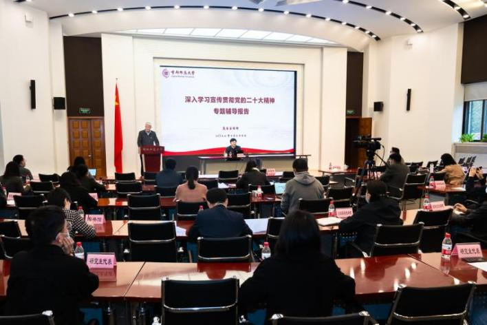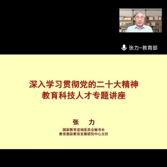 11月24日,学校邀请国家教育咨询委员会秘书长、教育部原教育发展研究中心主任张力作《深入学习贯彻党的二十大精神·教育科技人才》专题讲座,从办好人民满意的教育、完善科技创新体系、加快实施创新驱动战略、深入实施人才强国战略等方面,对党的二十大报告的第五部分进行重点解读。