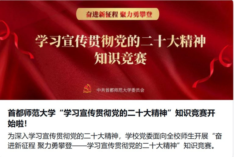 自党的二十大召开以来,首都师范大学坚持将学习宣传贯彻党的二十大精神作为首要政治任务,精心谋划部署,扎实有力推进,努力做到规定动作到位、自选动作出彩,以多种形式推动学习宣传贯彻党的二十大精神落地见效。