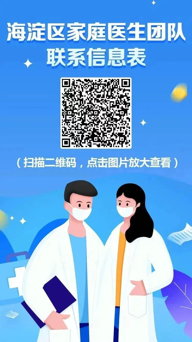 如有发热、咳嗽等有关新冠症状,请密切关注自己与家人的身体状况,如有需要及时就医,扫描二维码获取海淀家庭医生团队联系方式。