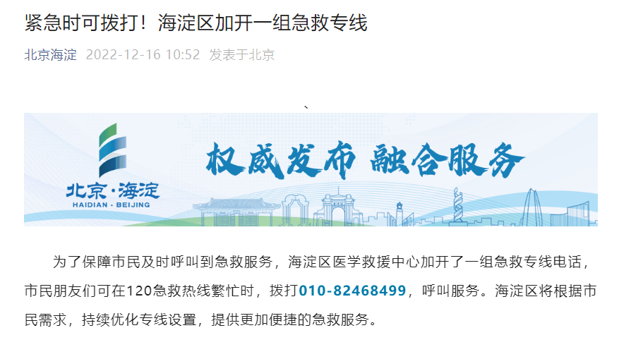 为了保障有需求的市民及时呼叫到急救服务,12月16日,海淀区从各部门和医疗机构抽调60人成立了海淀区120院前急救专班,并加开了一组24小时急救专线010-82468499,几天来专班与各医疗机构紧密配合,全力保障辖区居民的就医需求。