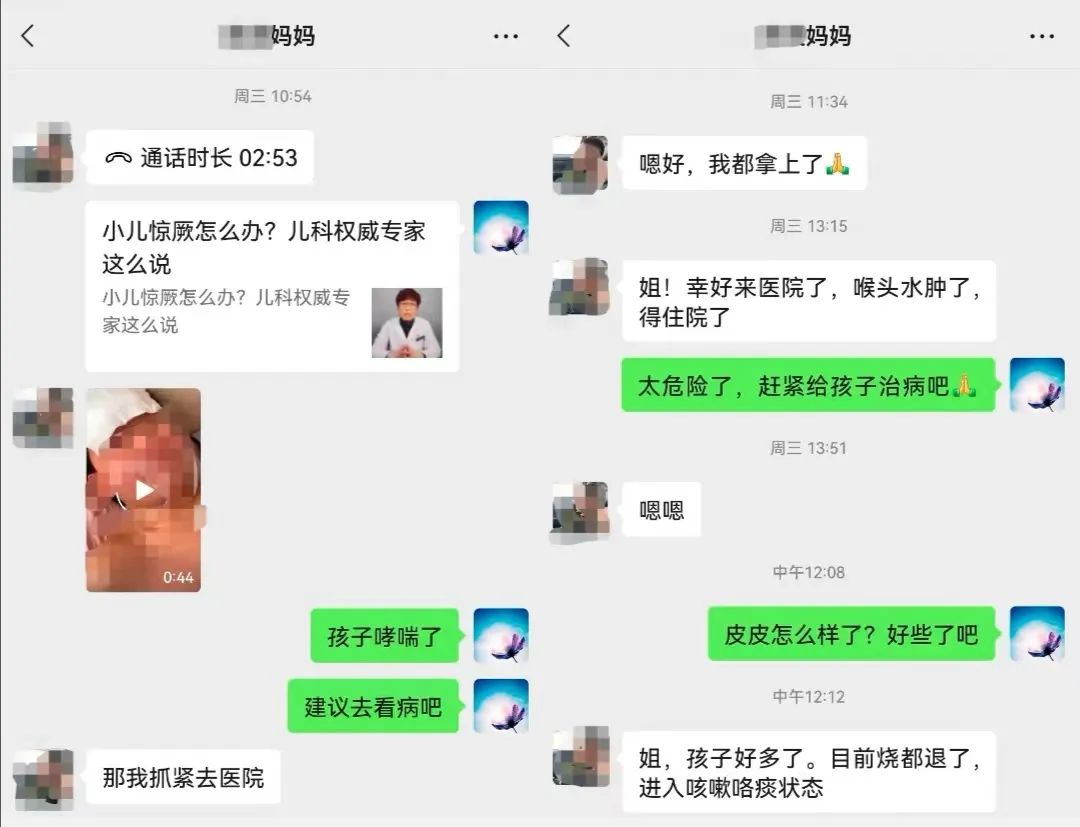 “仔细询问后,我发现家长用药剂量不太够,另外孩子有些嗜睡,看视频情况比较紧急,就建议家长尽快自驾车点对点前往医院就诊。后来家长反馈,孩子到达医院后就立即住院了,发现合并有喉头水肿,医院立刻给予了雾化、输液等治疗,总算有惊无险病情逐渐平稳。” 杨冬旭回忆说:“也提醒大家,如果孩子感染新冠病毒,出现高烧不退、嗜睡等症状,家长要及时关注,情况严重需要及时送到医院治疗。