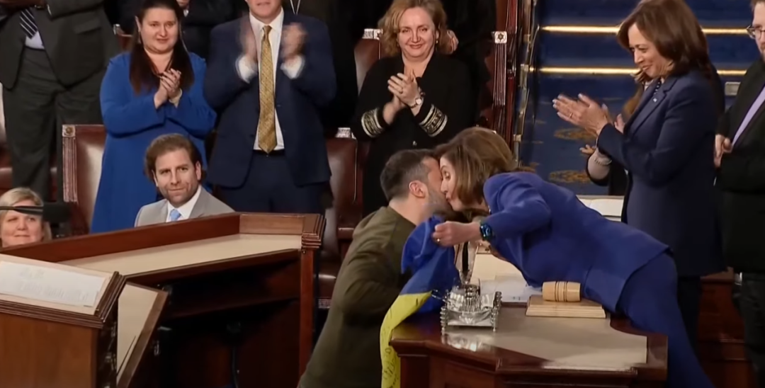 乌克兰总统泽连斯基将由乌克兰士兵签名的乌克兰国旗交给美国众议院议长佩洛西,并与其行贴面礼。图源:外媒视频截图
