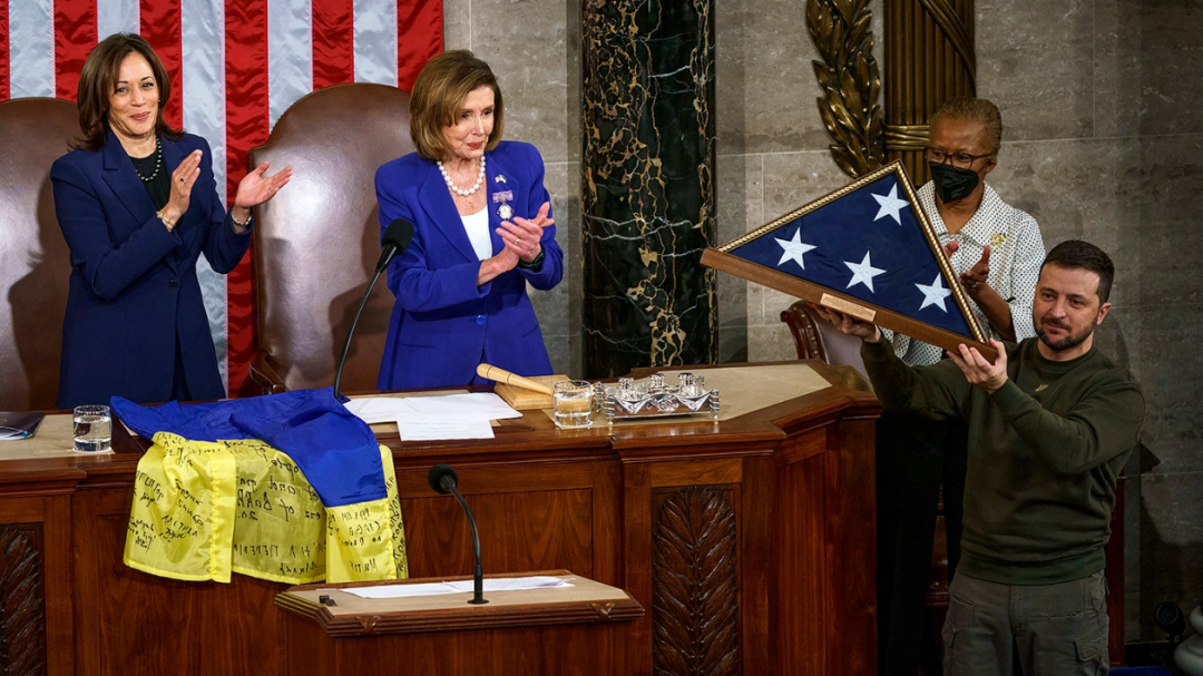 综合美国有线电视新闻网(CNN)及《国会山报》最新消息,乌克兰总统泽连斯基当地时间21日在美国国会发表讲话期间向美国会赠送了礼物——一面由乌克兰士兵签名的乌克兰国旗,以感谢美国向乌克兰援助武器;作为交换,美国众议院议长佩洛西将一面装在盒子里的美国国旗赠送给泽连斯基。