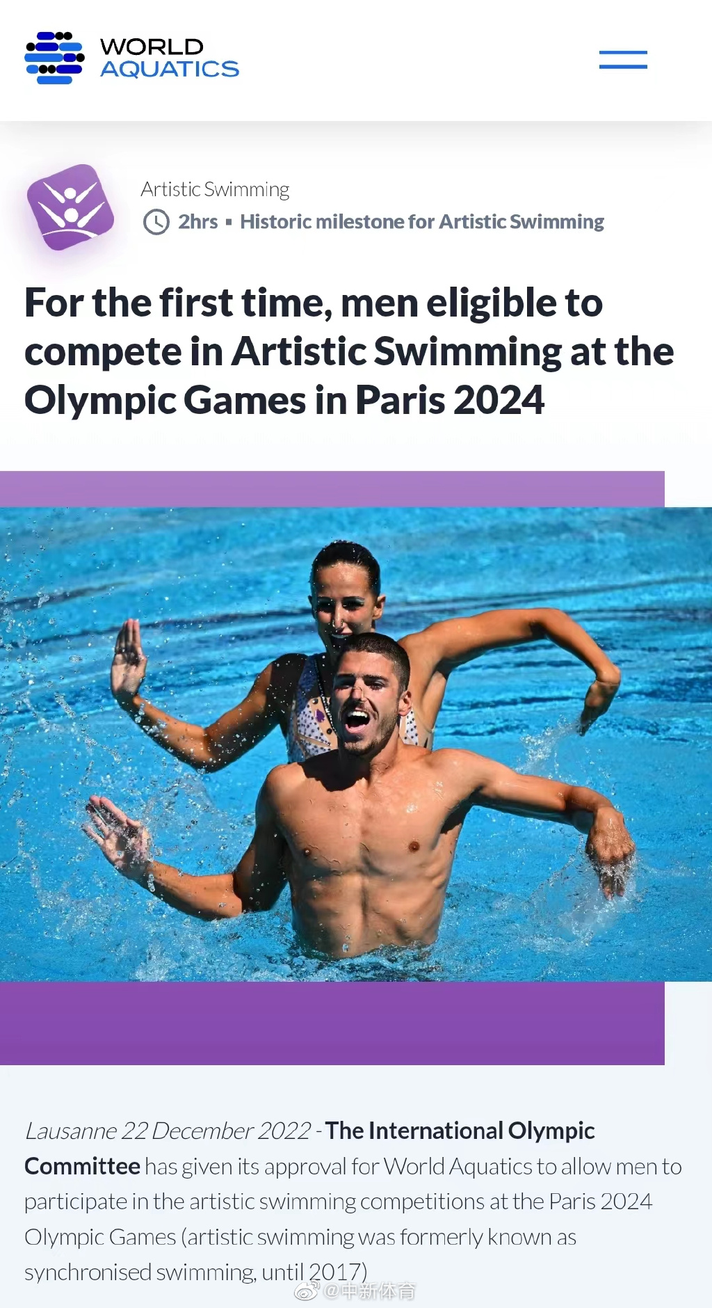 据世界泳联消息,在2024年巴黎奥运会花样游泳项目中,最多可允许2名男子选手参加集体比赛。