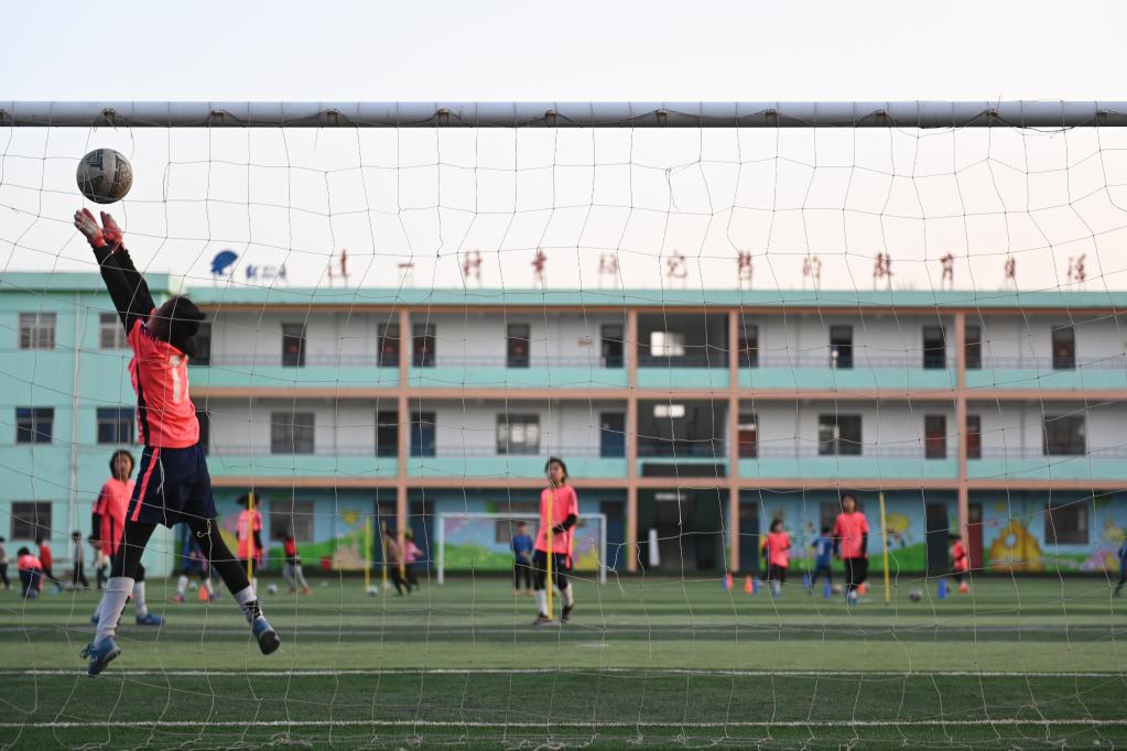 3月2日,河南省洛阳市孟津区平乐镇张盘小学操场上,女子足球队在训练中。新华社记者 徐嘉懿 摄