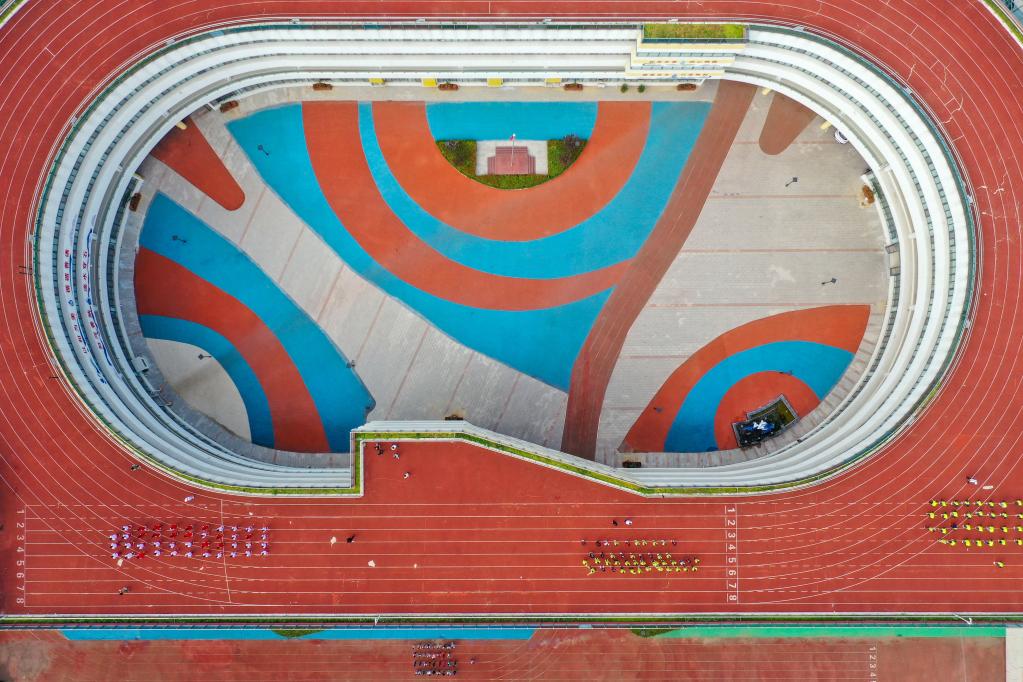 9月20日,山东省德州市齐河县第六小学学生在空中运动场上体育课(无人机照片)。新华社记者 朱峥 摄