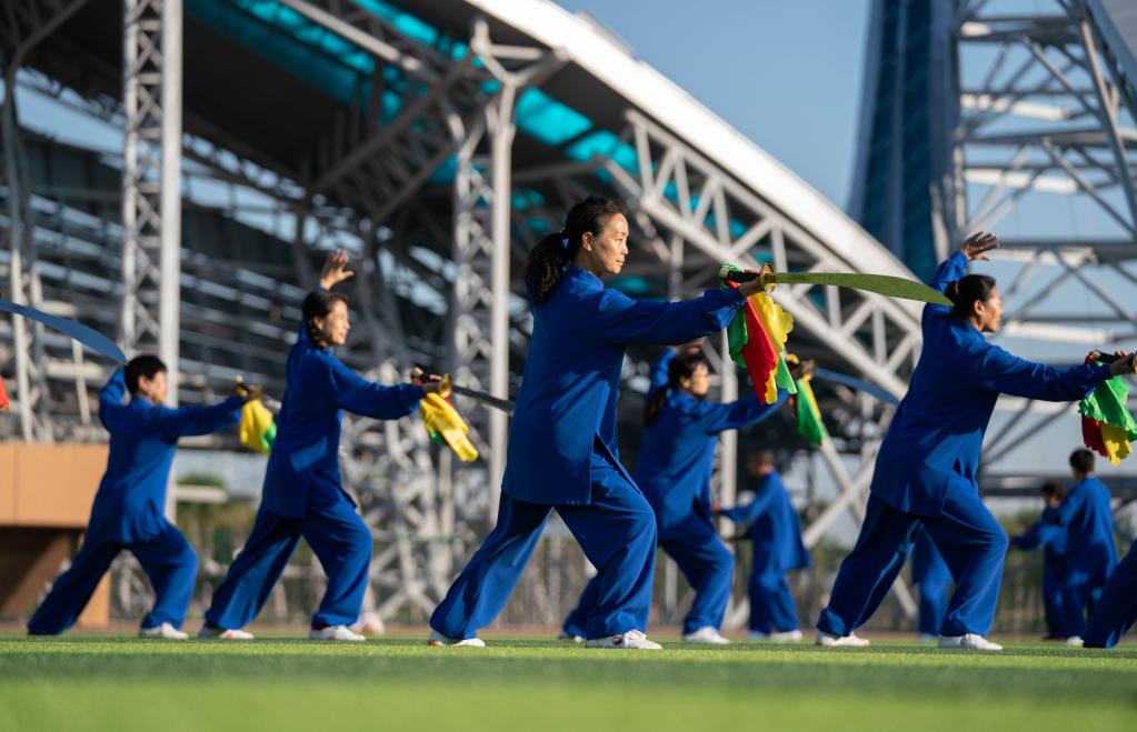5月27日,市民在河北省黄骅市天健湖共享体育场练习太极刀。新华社记者 骆学峰 摄