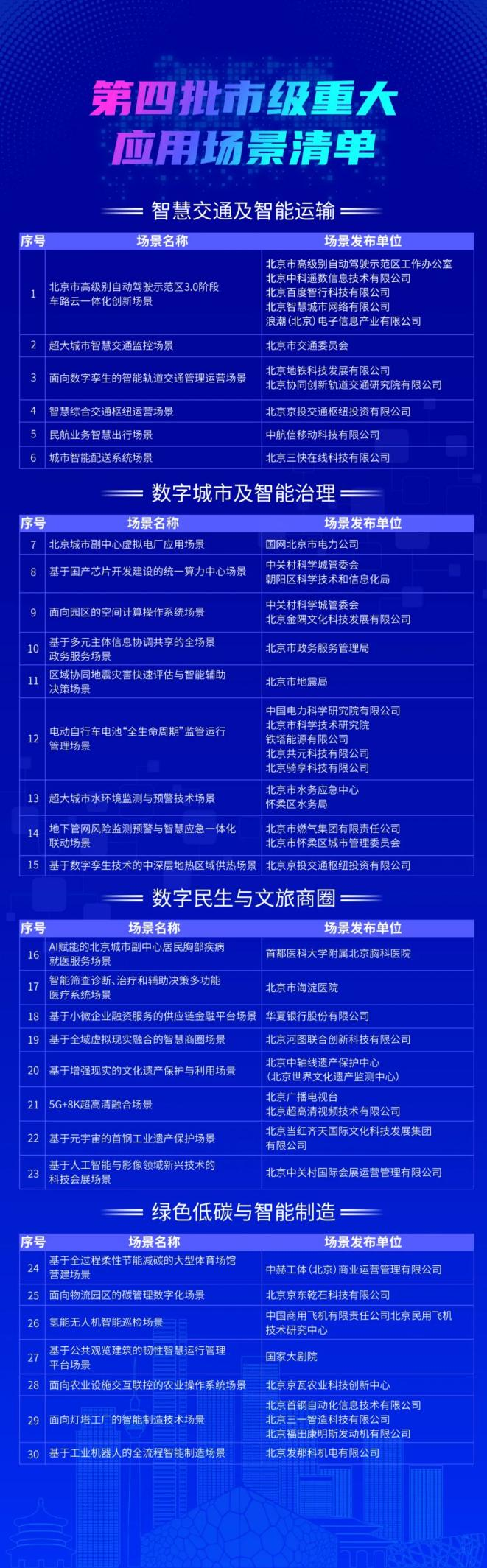 自今年4月以来,市科委、中关村管委会启动了第四批市级重大应用场景征集工作,在全市范围内共征集189个应用场景项目,按照技术前沿性、场景示范性、产业发展带动性等遴选标准,经过项目凝练、专家评审,最终形成了30项第四批市级重大应用场景。
