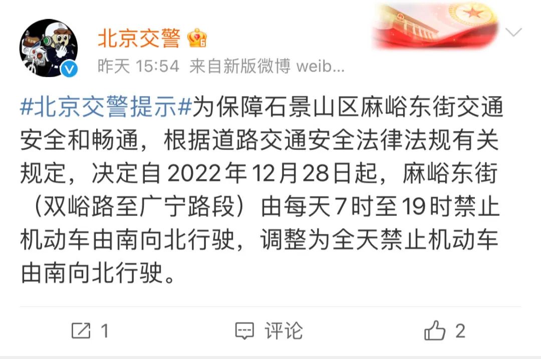 日前,北京交警官方微博发布消息:为保障石景山区麻峪东街交通安全和畅通,根据道路交通安全法律法规有关规定,决定自2022年12月28日起,麻峪东街(双峪路至广宁路段)由每天7时至19时禁止机动车由南向北行驶,