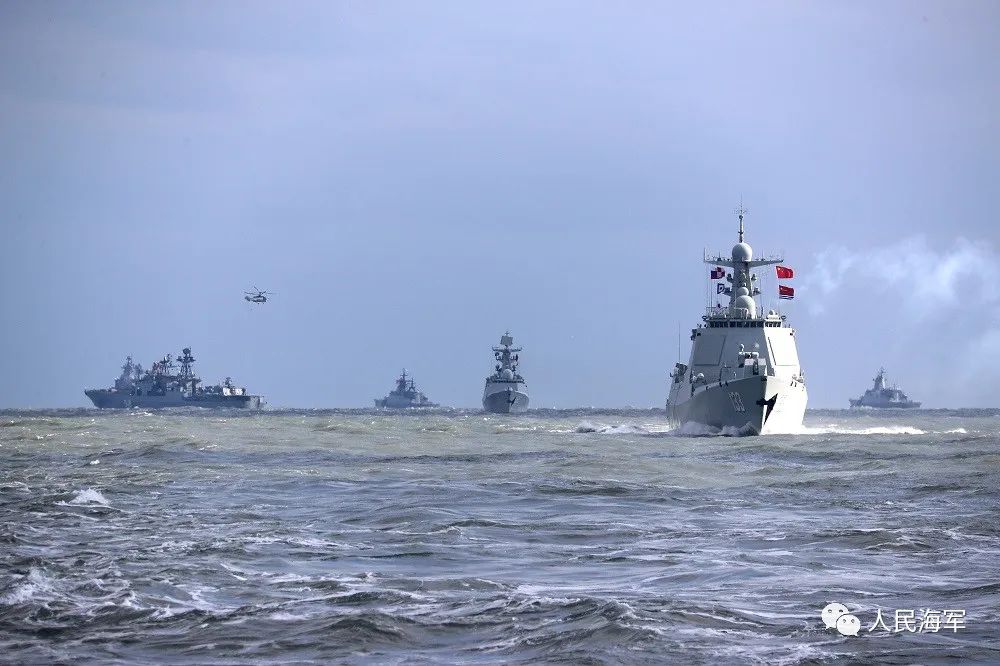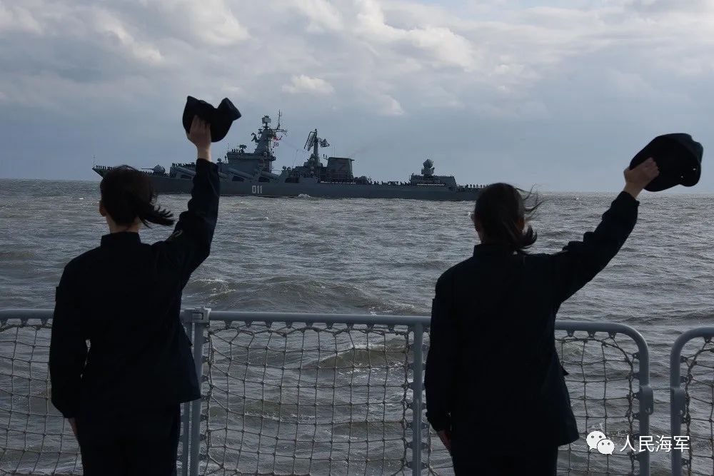 悬挂中俄两国国旗的参演舰艇编队,组成右双纵队,保持等间距、横距,各舰武器系统保持礼仪仰角,舰载直升机位起降平台系留,中方舰艇悬挂“UW1”欢送旗组,双方官兵位内舷分区列队。