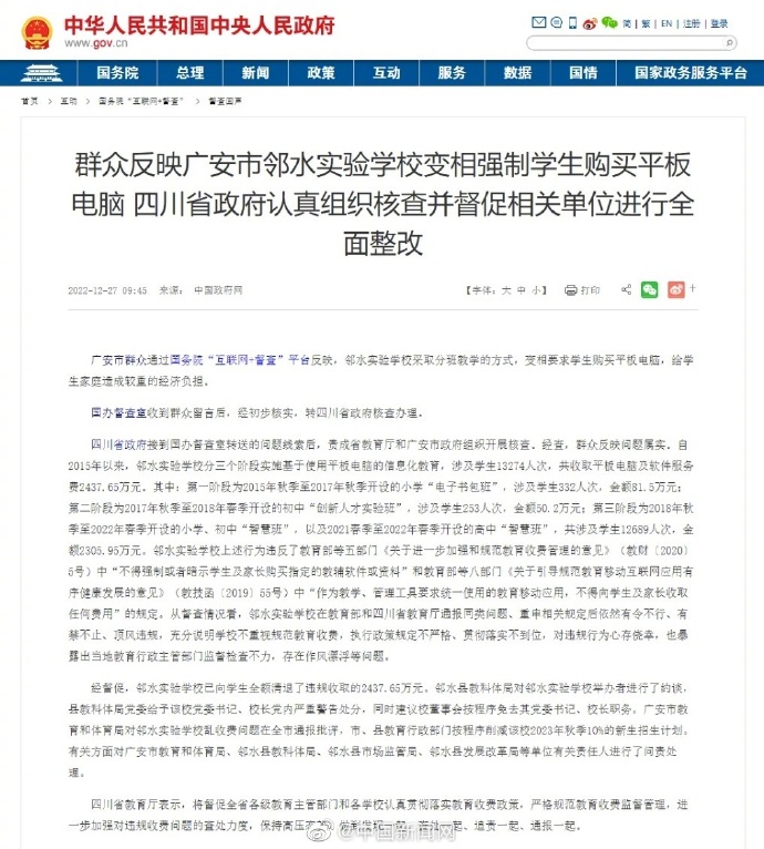 据中国政府网消息,四川省广安市群众通过国务院“互联网+督查”平台反映,邻水实验学校采取分班教学的方式,变相要求学生购买平板电脑,给学生家庭造成较重的经济负担。经查,群众反映问题属实。