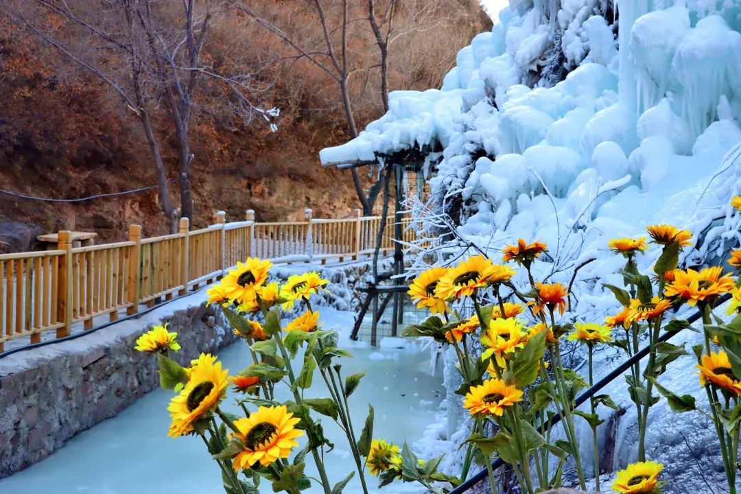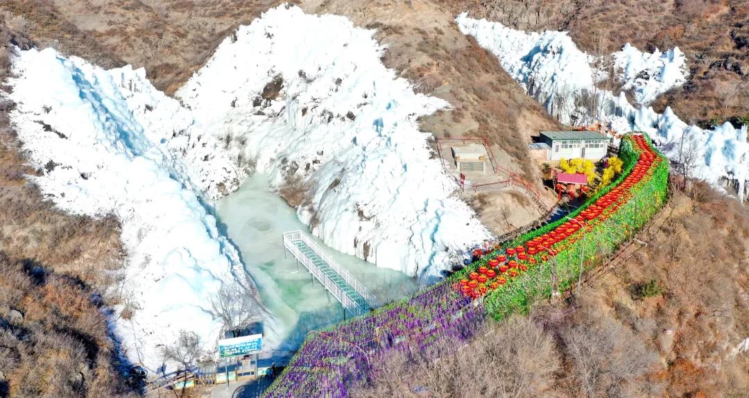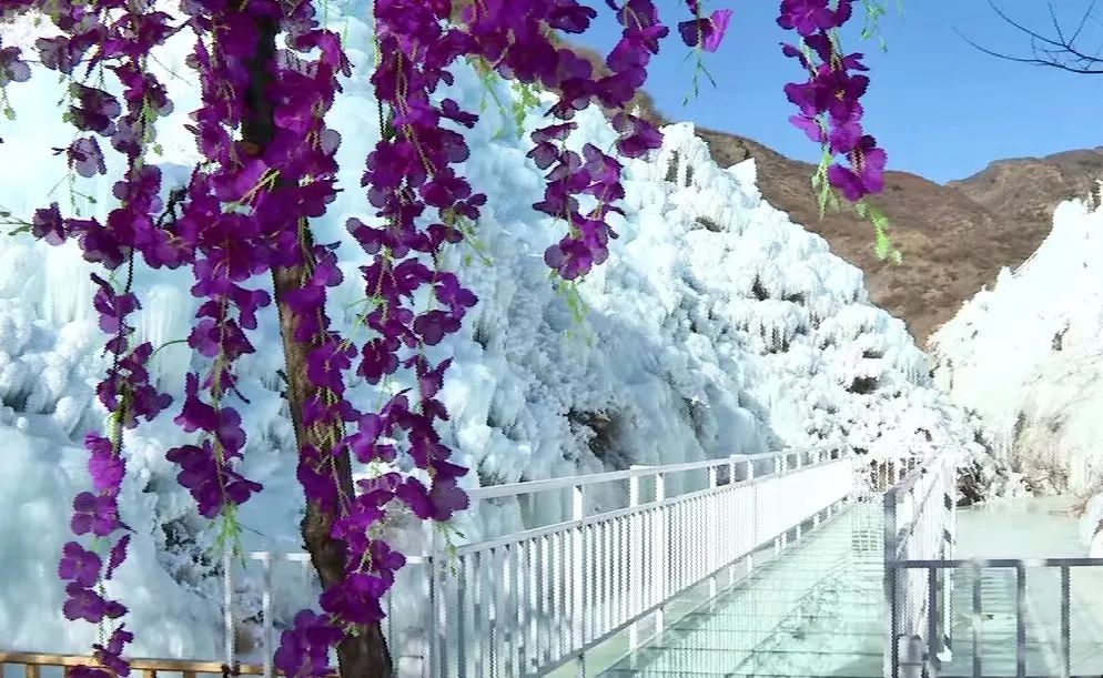 穿过由紫色藤蔓和大红灯笼装饰的长廊,山谷中的冰柱、冰瀑、冰挂连成一片,一团团一簇簇,一派晶莹剔透、银装素裹的景象,在冬日暖阳的照射下,冰瀑瑰丽夺目,令人赞叹。沿着蜿蜒曲折的山路拾阶而上,一步一景,变幻无穷。