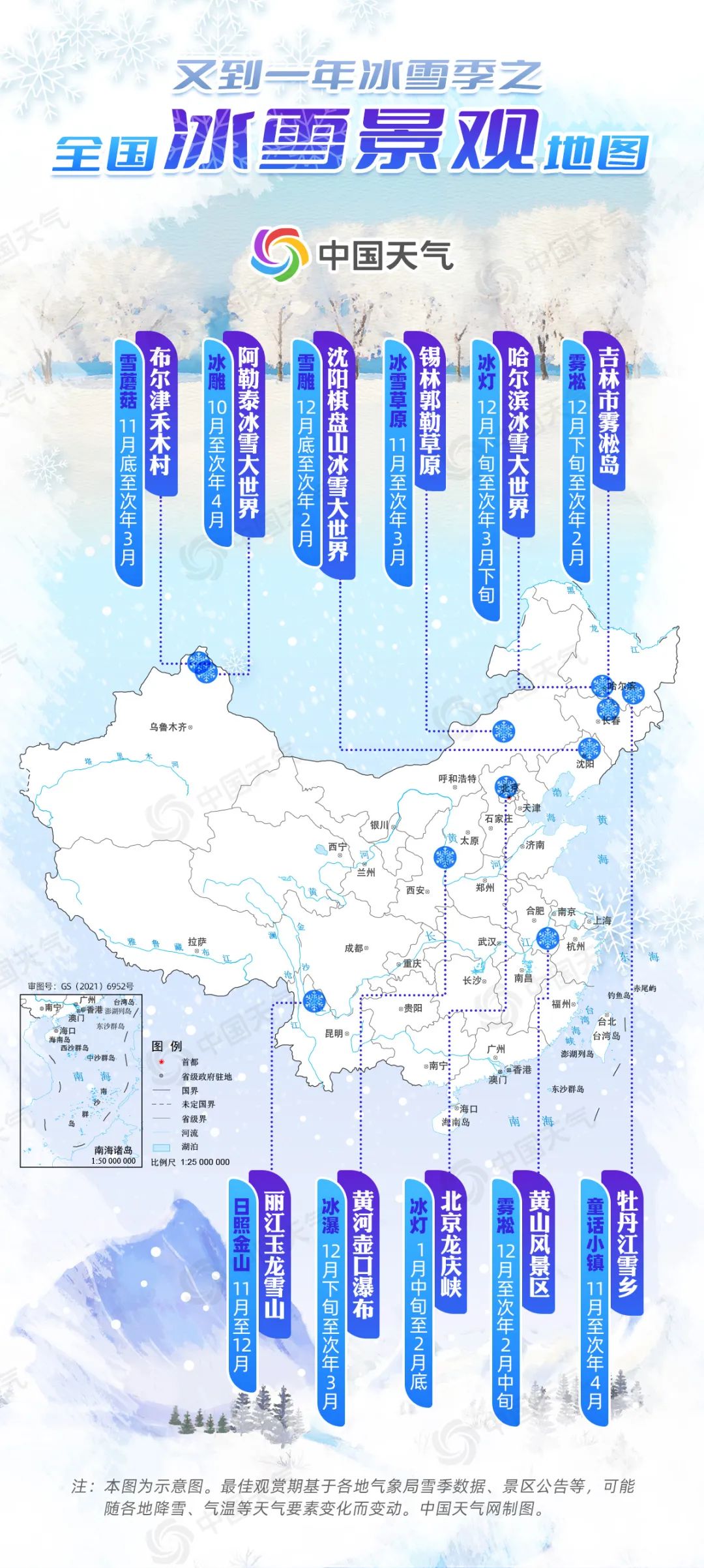 时值12月末,我国大部已是隆冬时节,冰雪景观也陆续迎来一年中最佳的观赏期。冰雪覆盖的童话小镇、晶莹剔透的雾凇、雄伟壮丽的冰瀑奇观都让人不禁感叹大自然的鬼斧神工;冰灯、雪雕等人造冰雪景观,同样令人目不暇接。又到一年冰雪季,中国天气网推出全国冰雪景观地图,一起领略大江南北冬日里的寒冷乐趣。