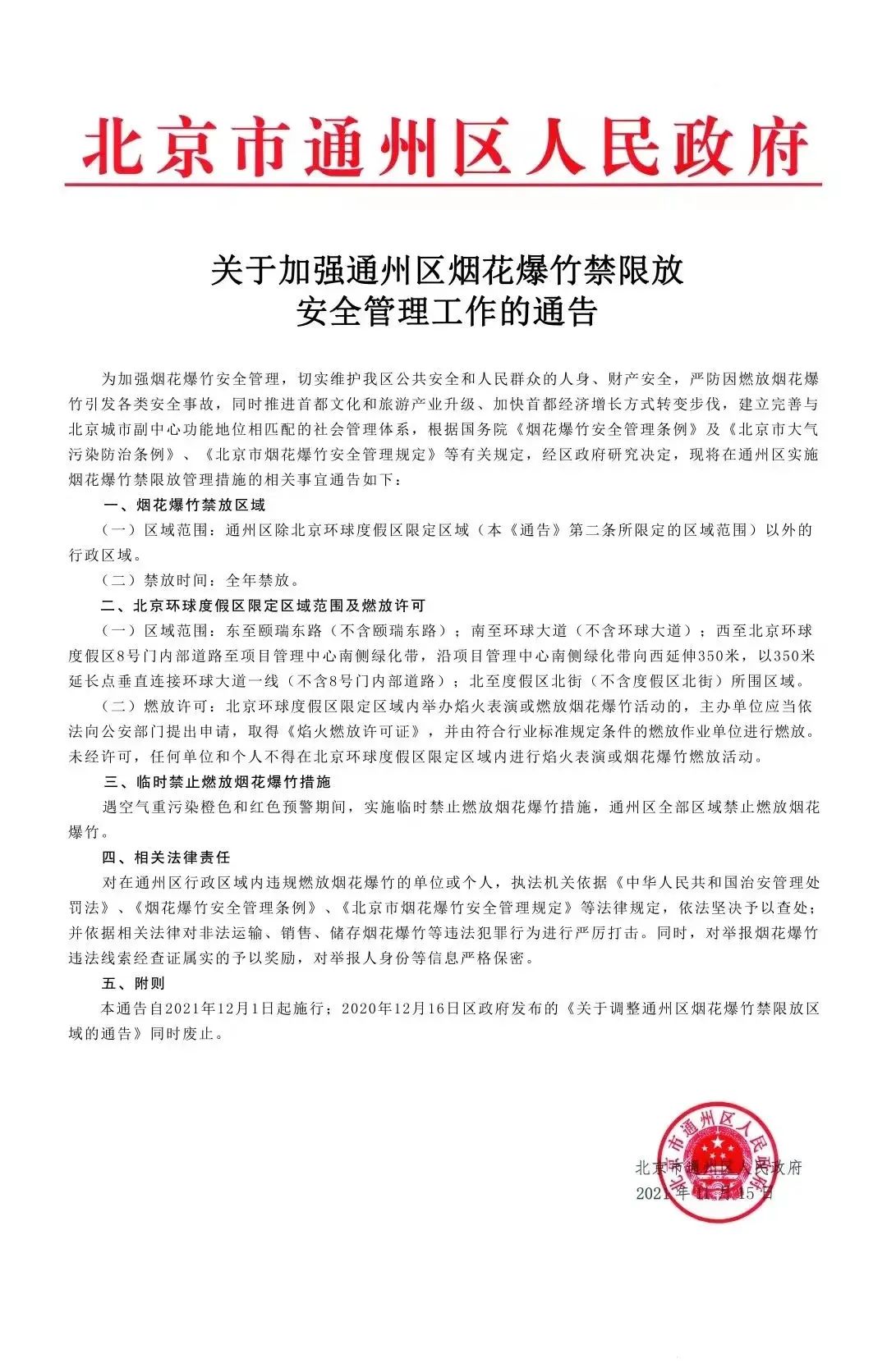 在此提示广大市民,目前通州区仍实行烟花爆竹禁放政策,《关于加强通州区烟花爆竹禁限放安全管理工作的通告》中明确规定:通州区除北京环球度假区限定区域以外的行政区域为烟花爆竹禁放区域,禁放时间为全年禁放。在北京环球度假区限定区域内燃放烟花爆竹,须经公安机关许可。未经许可,任何单位和个人不得在北京环球度假区限定区域内燃放烟花爆竹。