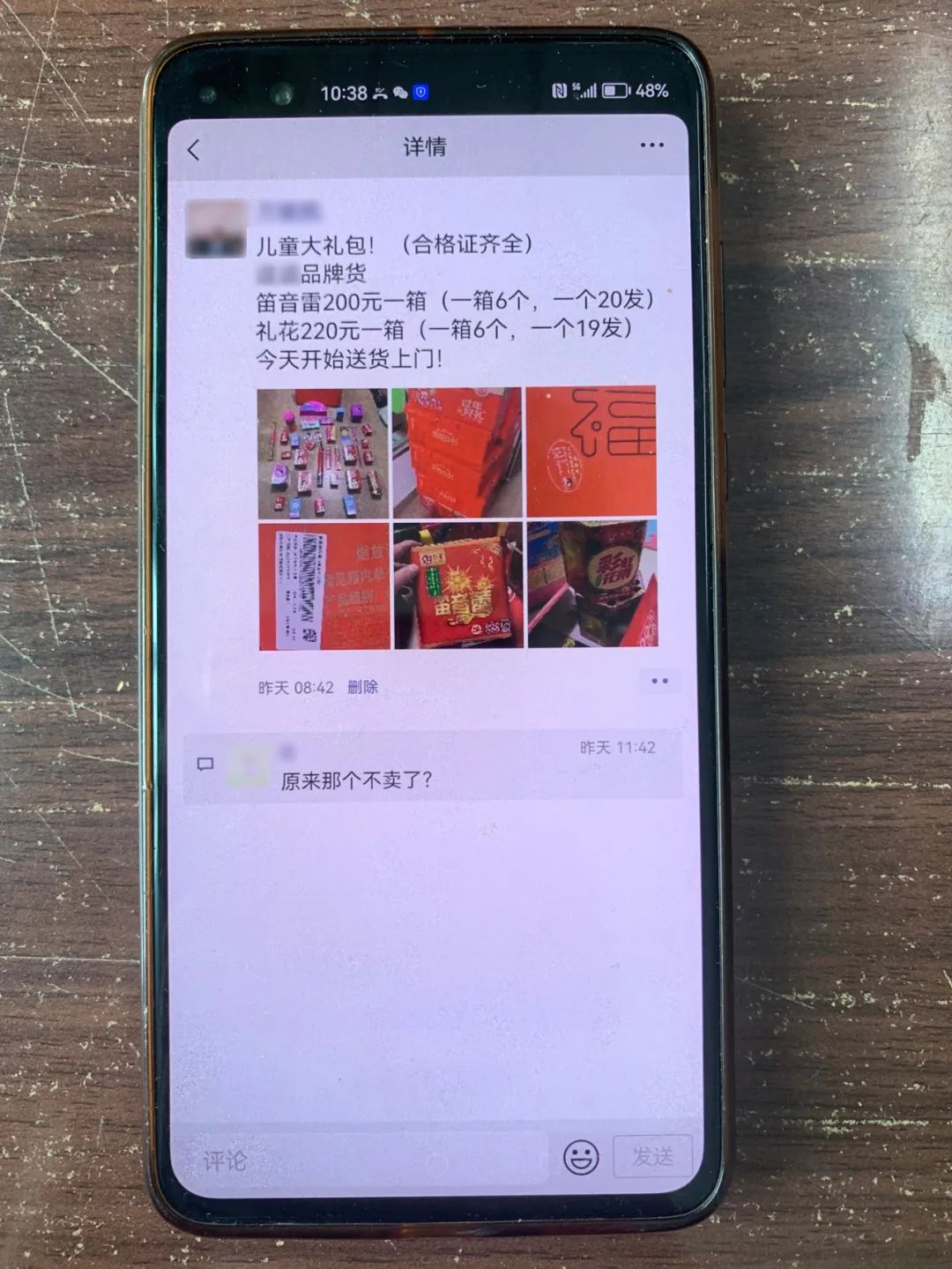 经民警现场查看,发现嫌疑人崔某(男,29岁)在自家平房院落西厢房内非法储存鞭炮、礼花、闪光雷等烟花爆竹46.5公斤,并通过微信朋友圈进行推销售卖。经崔某交代,烟花爆竹都是从张某某(男,30岁)处购买。民警循线将嫌疑人张某某抓获,其交代10余箱烟花均从河北省廊坊市香河县购买,后非法运输进京,自己燃放一部分后,将剩余10箱以1300元的价格卖给了崔某。