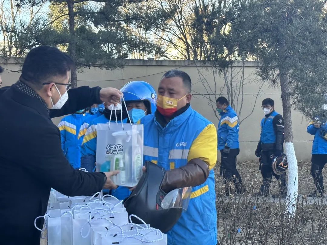 “平时工作起来接触的人和物比较多,工作也没个准点,这次送的洗手液、消毒剂等物资都很实用。”收到礼物的骑手小刘说道。