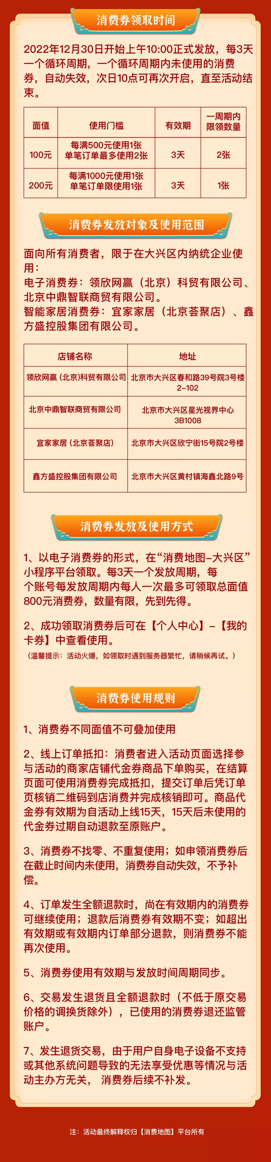 2022年12月30日上午10时起,北京市大兴区通过“消费地图-大兴区”微信小程序发放100万元消费券,供市民购买电子和智能家居使用。