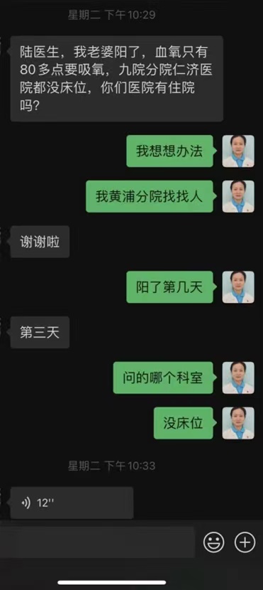 黄浦区家庭医生陆寒英也碰到过类似情况。12月27日晚上10时29分,她收到了居民戴老伯的微信求助,他的爱人、69岁的吴阿姨新冠阳性第三天,血氧饱和度为85%,急需吸氧,问了好几家医院都没有床位,情急之下只得求助于她。