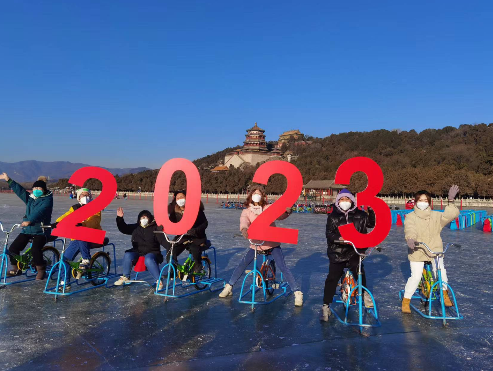 颐和园昆明湖冰场在元旦假期的首日开门迎客。晶莹剔透的昆明湖冰面成为百姓体验冰上娱乐的乐园。