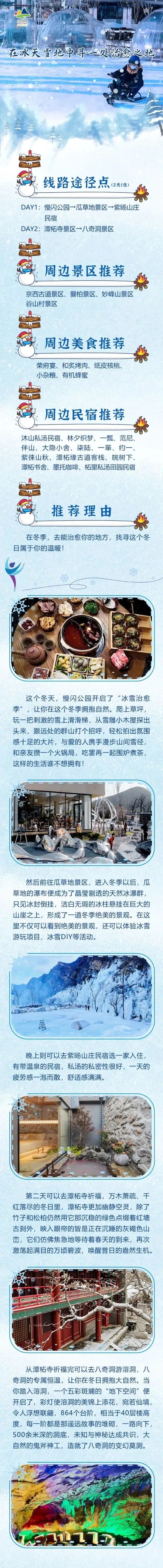 在谷山村厚厚的雪地里体验各式各样的冰雪项目,感受冬日的速度与激情;到灵溪景区穿越冬季森林,体验冰上漂流;赏神泉峡赏冰瀑奇观,看炫彩纷呈的冰雪世界;到东马山家·木兰塾体验冬季特色主题活动,静享冬日山间暖时光;去冬季的爨柏景区捕捉瑞雪奇景,感受古村的冬日之美;再到白瀑云景的冰上帐篷里喝一碗鱼汤,品尝鱼羊鲜火锅,让这个暖冬充满幸福的味道;在慢闪公园畅玩冰雪乐园,于山谷间品尝鲜味火锅;到瓜草地风景区看冰瀑沿山石而居,呈现出千姿百态,雄伟壮观的冰雪世界;宿紫旸山庄,煮一壶热茶,泡一池暖汤,探寻山谷间的冬日乐趣;去千年古刹潭柘寺看满院的青松翠竹,点缀在红墙碧瓦、飞檐翘角之间;在八奇洞打卡壮观的天然溶洞,欣赏大自然的鬼斧神工。