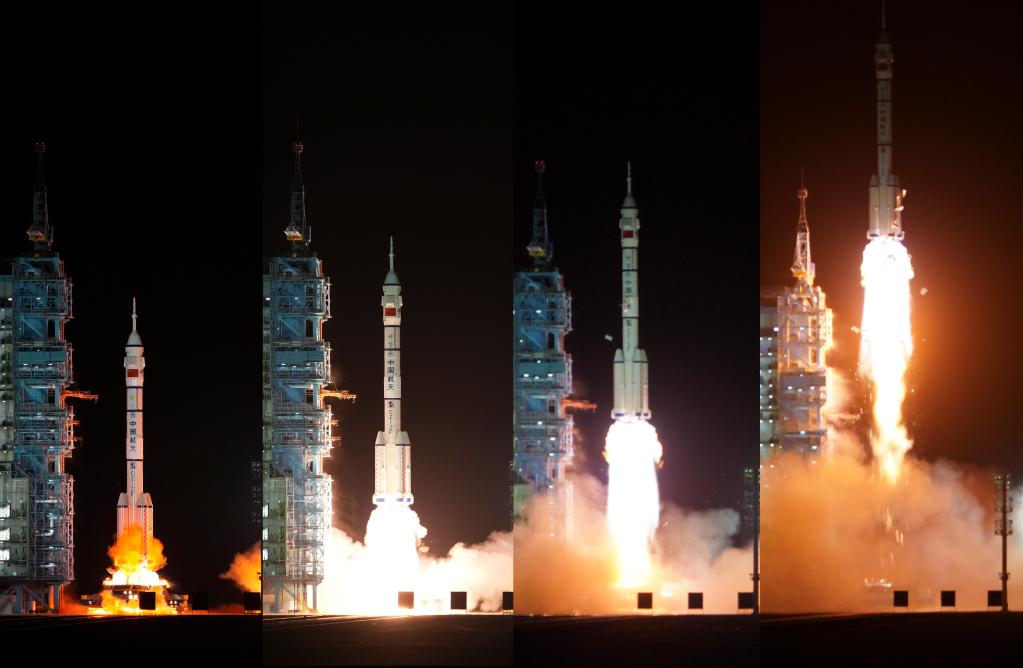 2022年11月29日,搭载神舟十五号载人飞船的长征二号F遥十五运载火箭在酒泉卫星发射中心点火发射,约10分钟后,神舟十五号载人飞船与火箭成功分离,进入预定轨道,航天员乘组状态良好,发射取得圆满成功(拼版照片)。新华社记者 李刚 摄