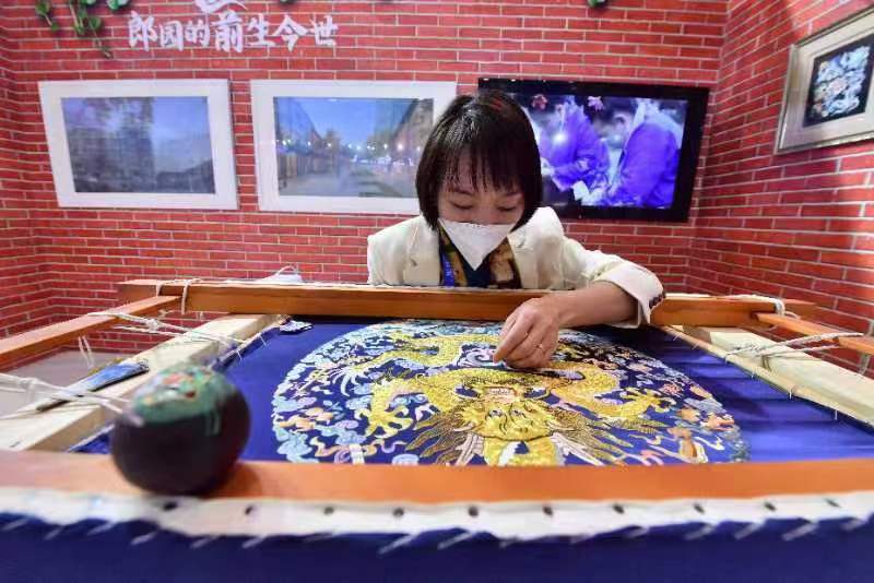 造型华丽的五爪金龙,雄踞龙袍之上霸气十足;憨态可掬的金虎,细嗅蝴蝶妙趣横生……在文博会北京展区,宫绣第五代传承人刘晓燕的件件作品令观众啧啧称奇。展区以首创·郎园品牌为重点案例,展示了通过创建非遗资源聚合平台,实现非遗活态传承的成功实践,折射出北京文化产业园区的高质量发展。