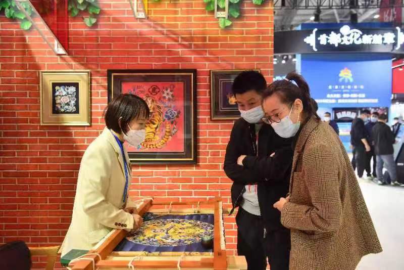 在第十八届中国(深圳)国际文化产业博览交易北京展区,京绣传承人刘晓燕在现场展示传统技艺。蔡代征摄