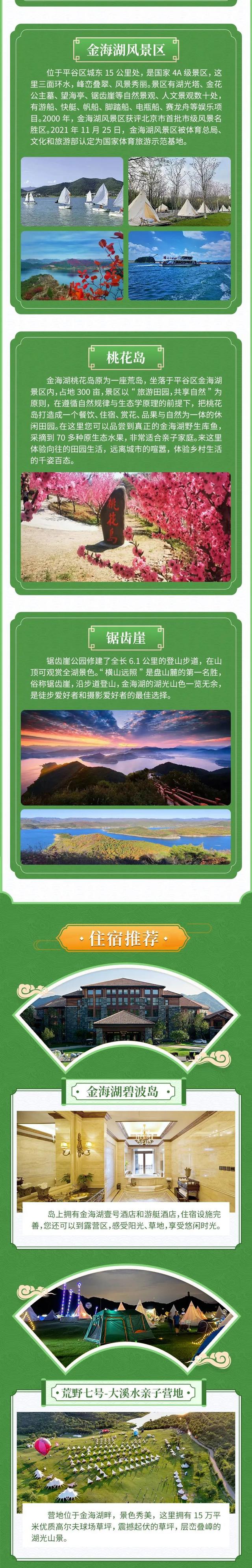 “桃醉平谷·金海露营”是北京市文化和旅游局与平谷区政府共同打造的微度假目的地品牌。以金海湖景区为中心,联合周边包涵金海湖碧波岛、荒野七号——大溪水亲子营地、小溪谷森林露营地、上宅文化陈列馆、金海湖H生活馆、山田心农场、代舍民宿等多元业态。音乐、party、沙龙、飞盘、橄榄球、健身娱乐、DJ、电竞等时尚业态围绕金海湖露营地常态化上演,金海湖地区也逐渐成为各类时尚活动聚集地,是引领市民及游客目标性、精准化、品质化的时尚休闲生活目的地。