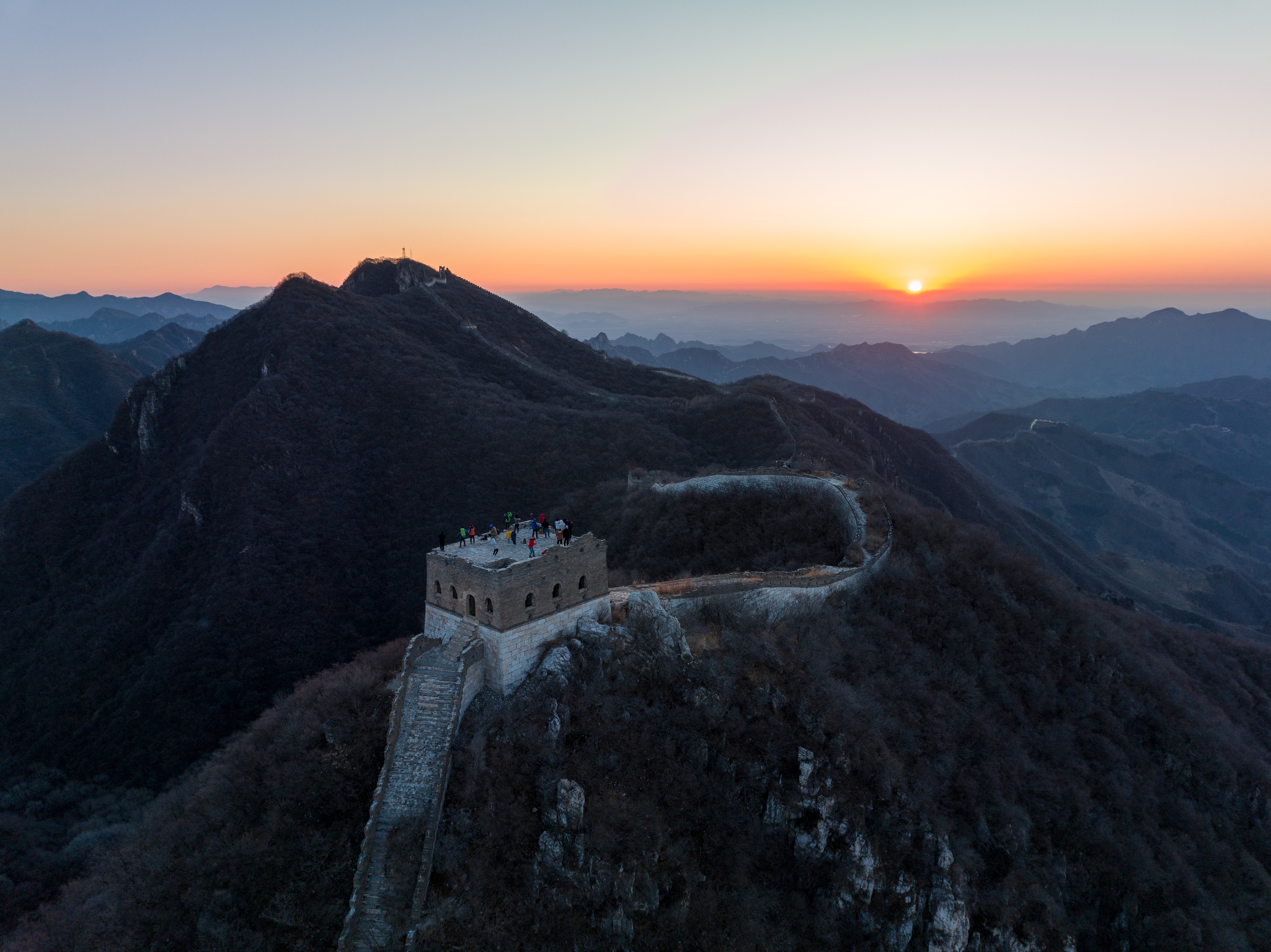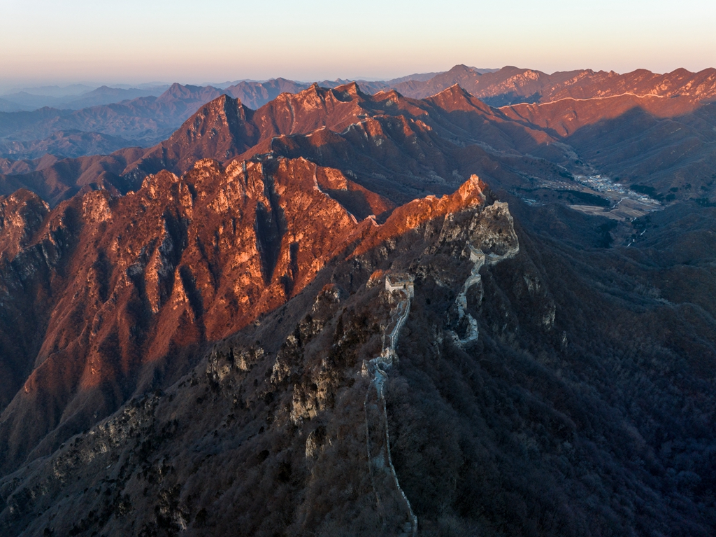 起飞时,幽蓝的夜空,满天星斗。无人机冲破寒冷,飞跃云霄,俯瞰连绵起伏、错综复杂的长城,镜头里,城墙圆润的弧线也掩盖不了箭扣的铮铮铁骨,让人无比震撼。