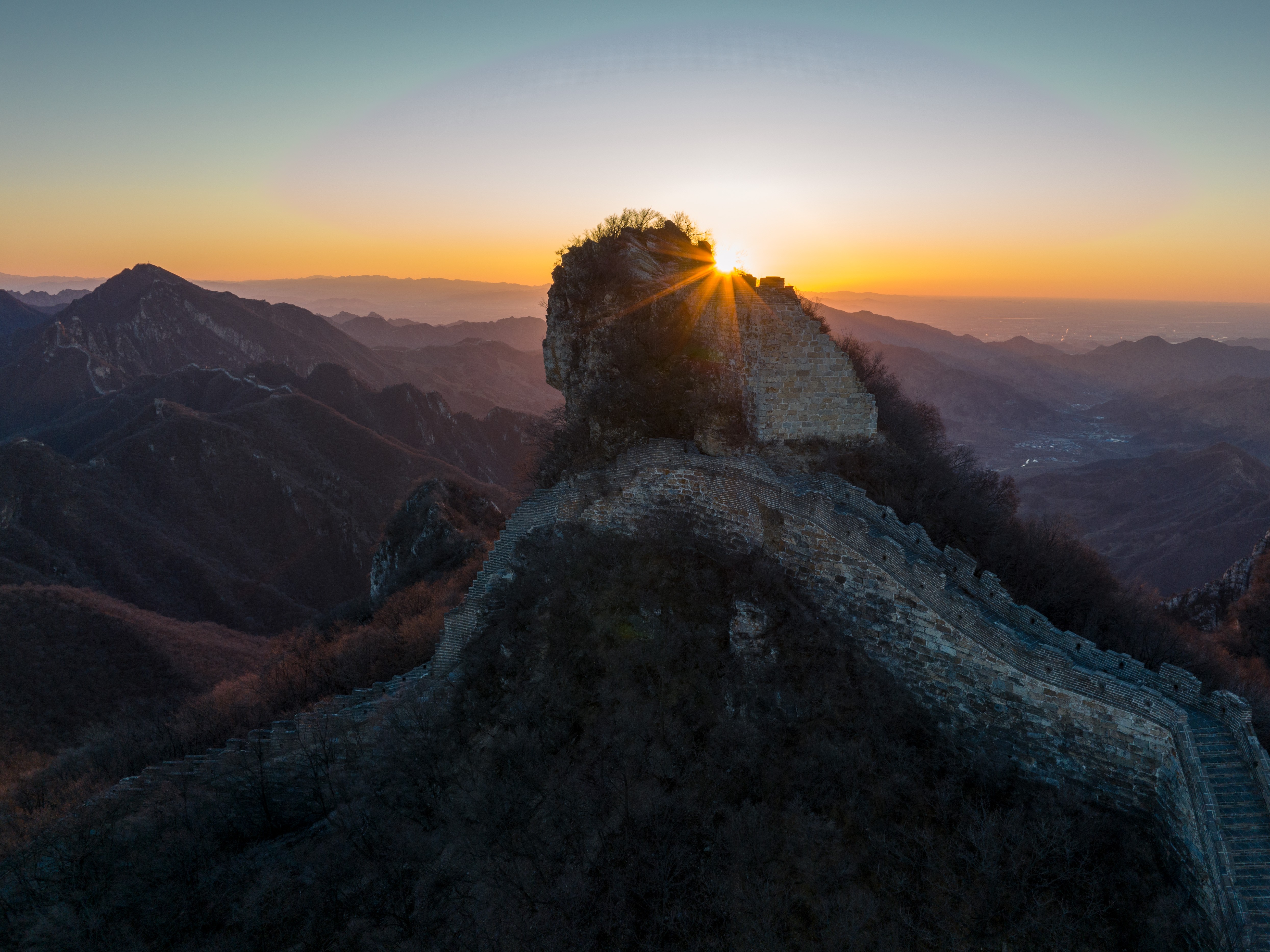 2023年1月1日,摄影师韦悦忠第七次拍摄长城新年日出,地点,选择了他最爱的箭扣长城。这次,他选择在长城脚下,通过无人机航拍,迎接2023年的第一缕阳光。