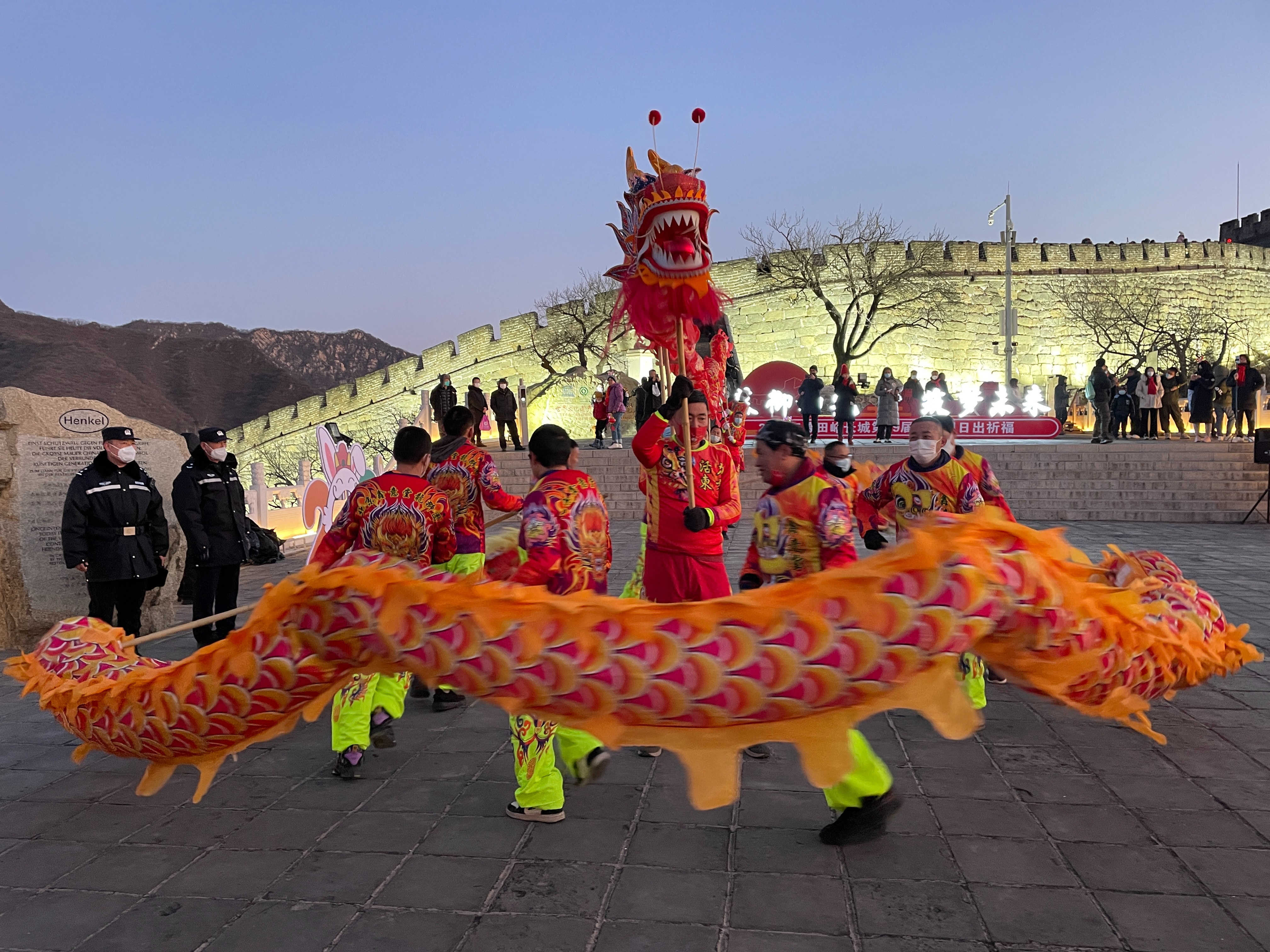 清晨6点30分,天还未亮,已有游客乘坐缆车,登上了慕田峪长城14号敌台,等待新年的第一缕晨光。在等候期间,激昂的鼓声响起,舞龙、舞狮表演先后上演,振奋人心的乐曲伴着观众的阵阵欢呼声在山间回荡。
