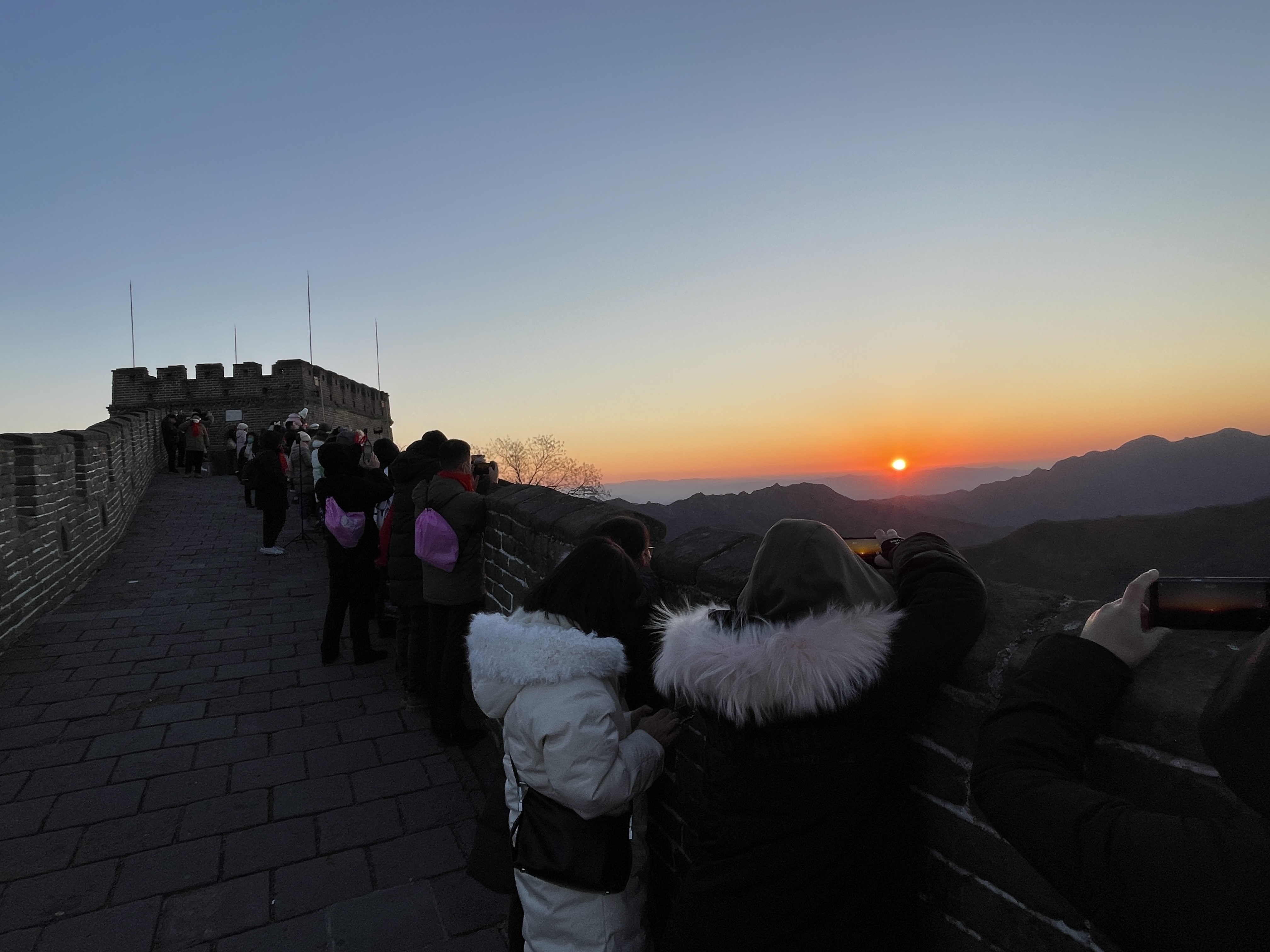 2023年的第一缕阳光洒向大地,在怀柔区慕田峪长城上,三百多名游客举着手中的相机、手机,记录下这新年第一天的日出。在慕田峪长城景区第29届元旦迎日祈福活动中,游客们还欣赏到了精彩的武术表演、舞龙舞狮等节目。