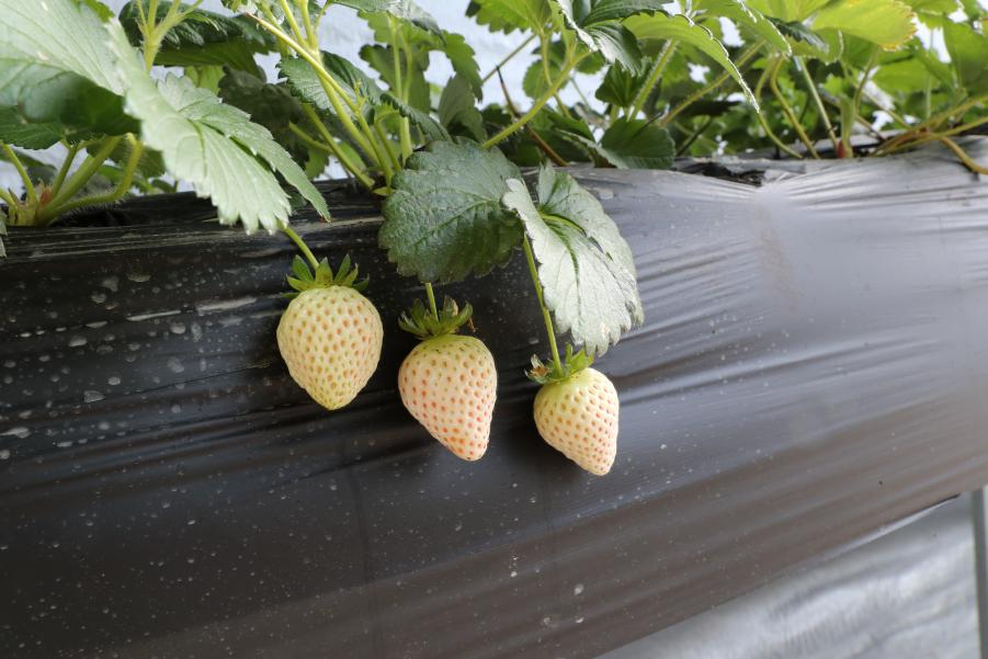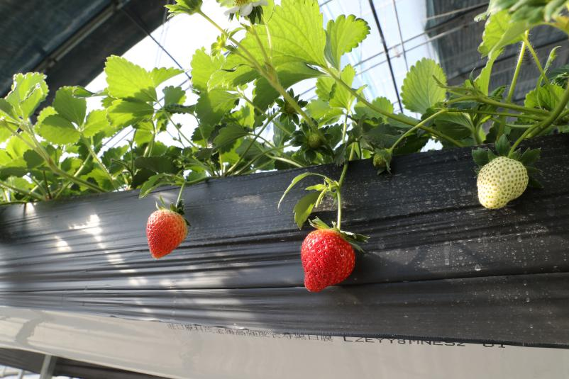 记者在杨镇神农天地种植园内看到,一排排钢质高架槽内长满草莓,园区内50万余只小蜜蜂,每天为草莓授粉。绿叶下一个个草莓若隐若现,娇艳诱人。