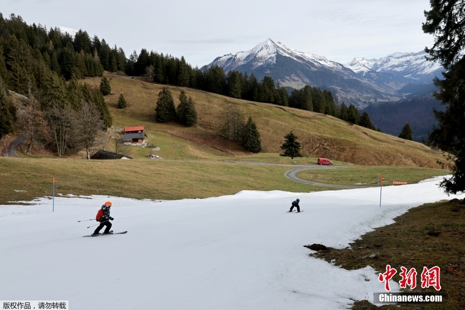 当地时间1月4日,瑞士莱森冬季气温高于往常,阿尔卑斯山一处滑雪胜地仅剩一层薄薄的人造雪。图为滑雪者在人造雪上滑行。