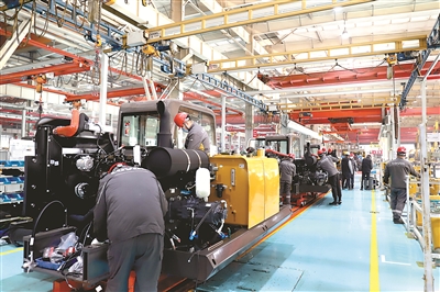 随着疫情防控措施的持续优化调整,各地复工复产加快,复商复市回暖。图为1月3日,青岛西海岸新区一企业生产车间内,工人们在赶制装载机订单。(图片来源:视觉中国)