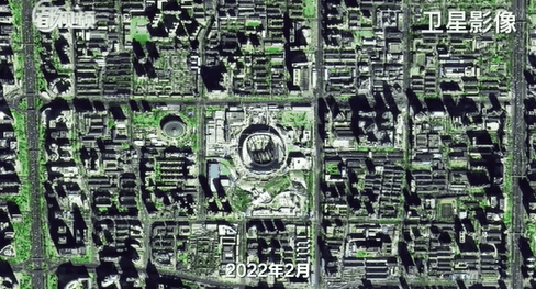 2022年2月,“看台碗”轮廓在卫星图上初步显现。仅一个月后,新工体建设就进入了钢屋盖涂料喷涂阶段。4月,随着罩棚最后一组支撑架的拆除,“新工体”钢结构施工顺利完成,展露出弘大的穹顶。如今,在新工体壮观的钢罩棚下,一张张崭新的“国槐绿”座椅已陆续安装到指定位置。