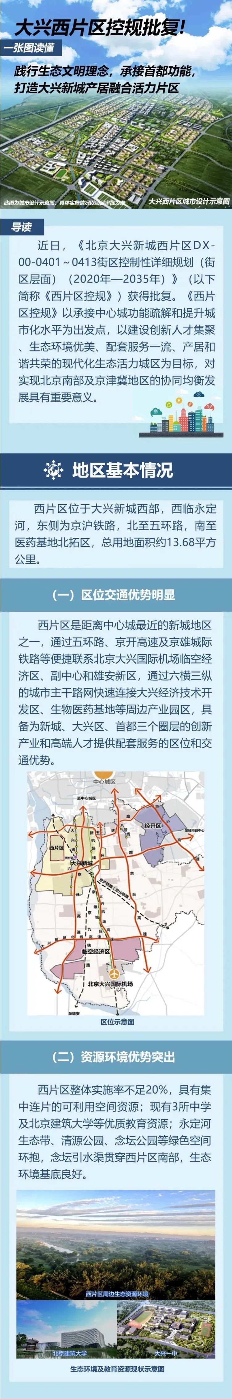 大兴西片区是大兴区优化新城职住结构,完善生产生活配套服务空间供给,提升大兴新城综合服务保障能力及承接中心城功能疏解的重点地区。1月5日,《北京大兴新城西片区DX00-0401~0413街区控制性详细规划(街区层面)(2020年—2035年)》方案已在大兴信息网上对外公开,未来这里将打造成为生态环境优良、文化底蕴彰显、配套服务完善、空间活力四射、创新人才集聚的现代化生态宜居之所。