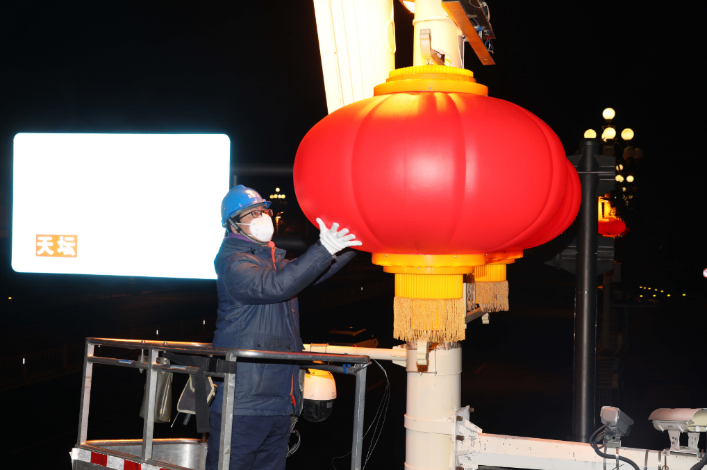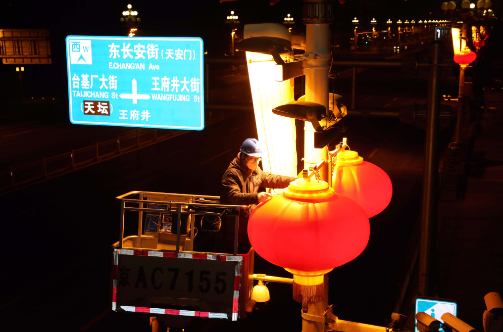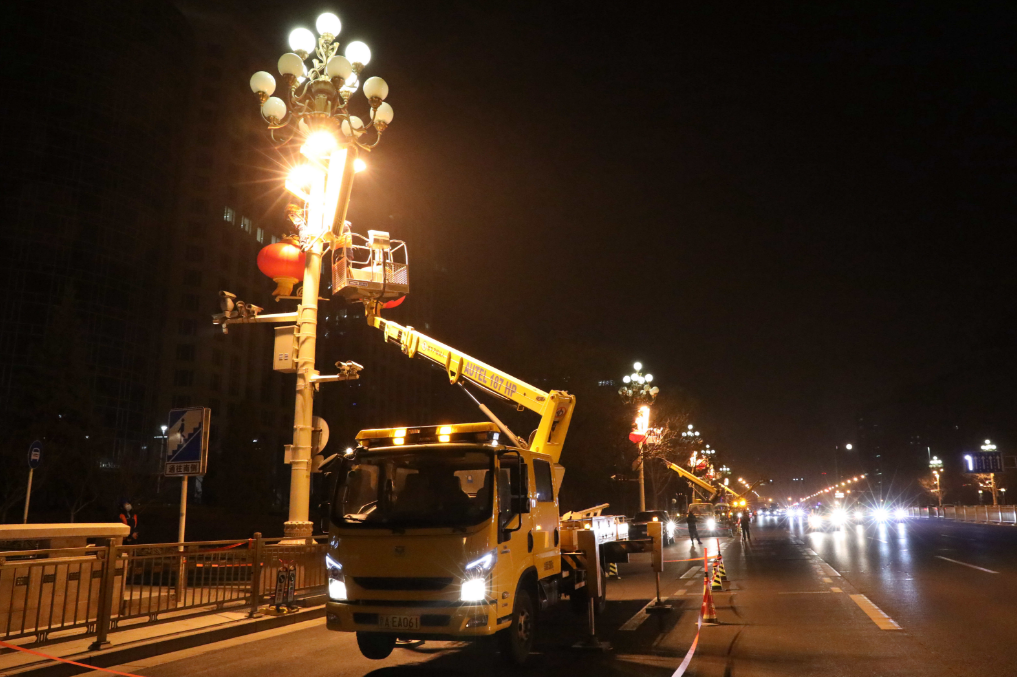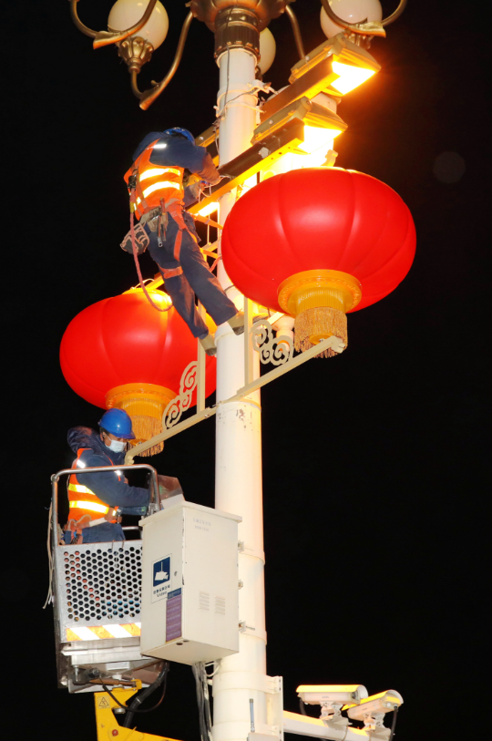 6日凌晨,长安街东单路口,三辆电力高车整齐停在一基华灯旁边,国网北京电力城市照明管理中心工作人员正在熟练地作业,有条不紊地安装、调试大红灯笼。