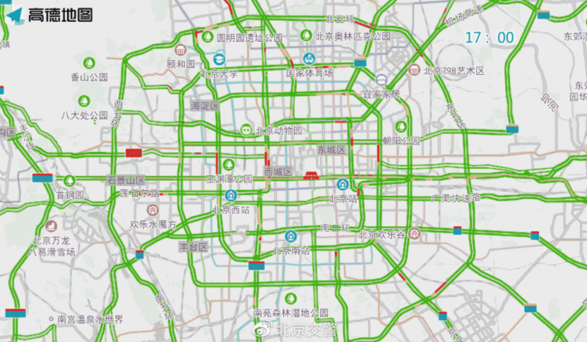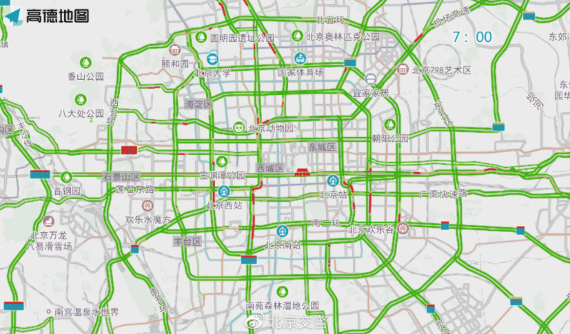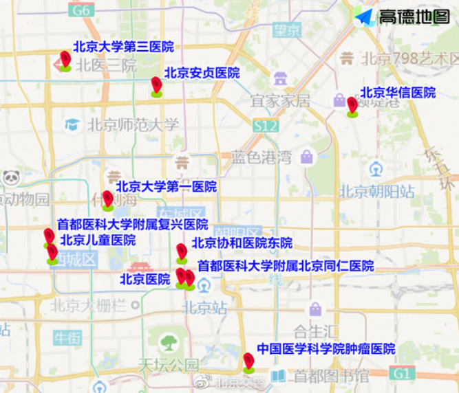 早高峰至上午时段,北医三院、复兴医院、北京医院、西苑医院、同仁医院、积水潭医院等医院门前及周边道路车流量较大,高峰时段预计为7至10时。