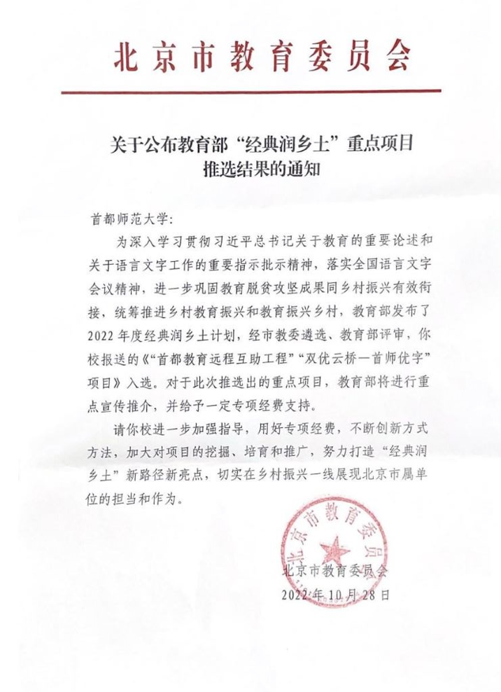 近日,北京市教育委员会发布了教育部“经典润乡土计划”重点项目推选结果的通知。首都师范大学报送的《“首都教育远程互助工程”“双优云桥·首师优字”项目》经市教委遴选、教育部评审,成功入选“经典润乡土计划”重点项目,是北京市唯一一个入选项目。