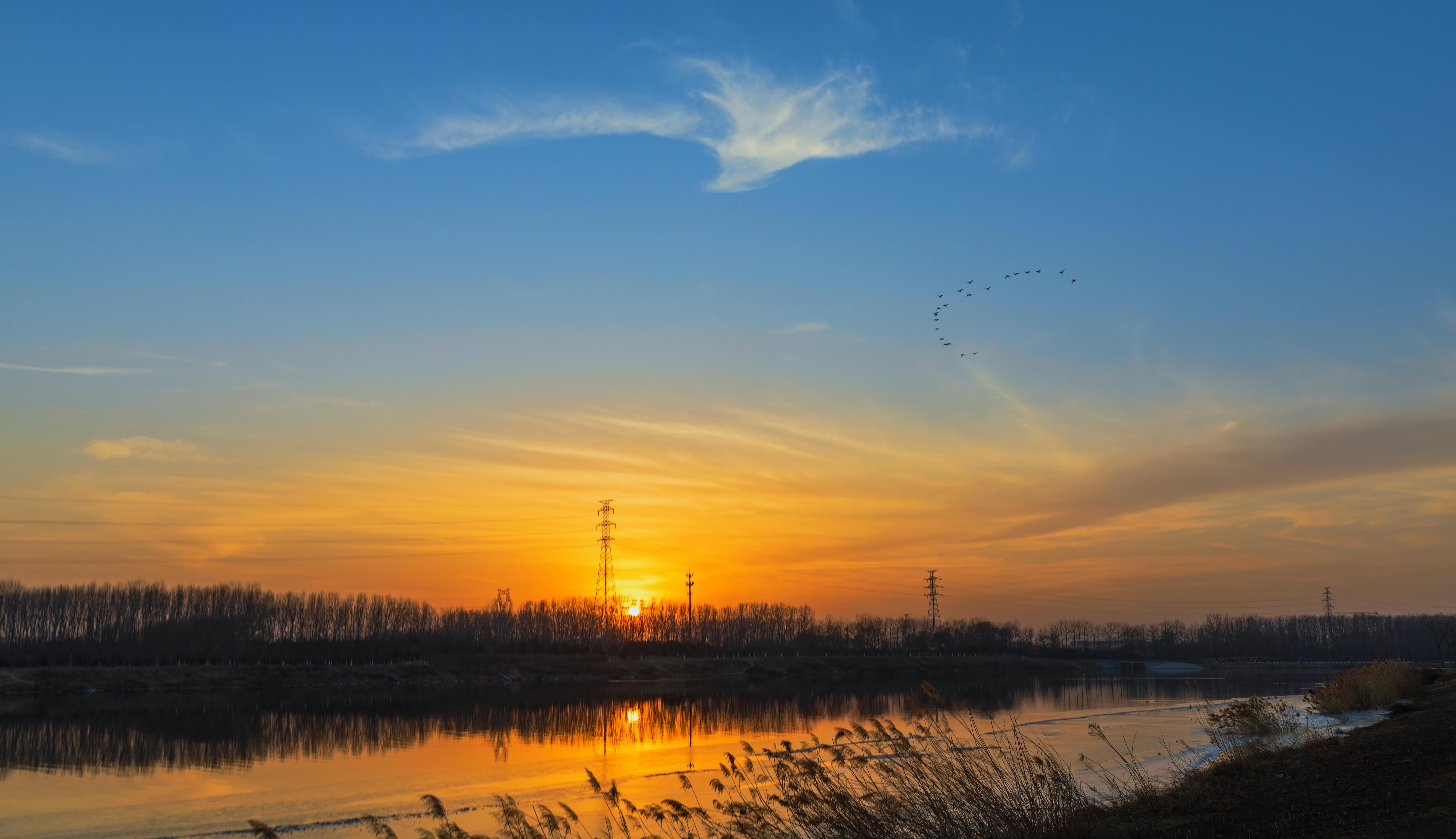 大运河畔,天空中绚丽的晚霞映照在河面上,如同一幅油画。