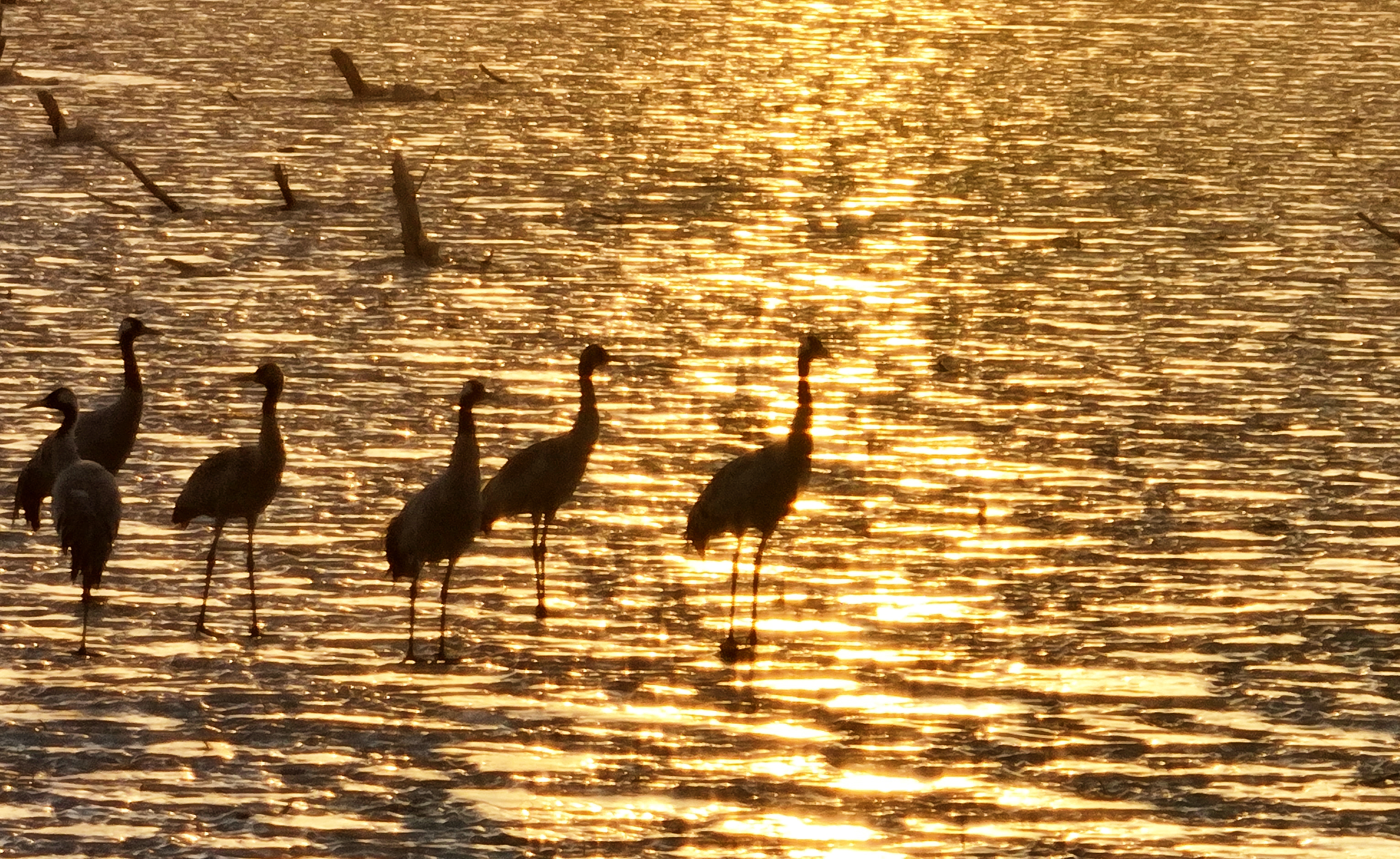 官厅水库,落日和晚霞的照映下,几只灰鹤在水中悠闲踱步。
