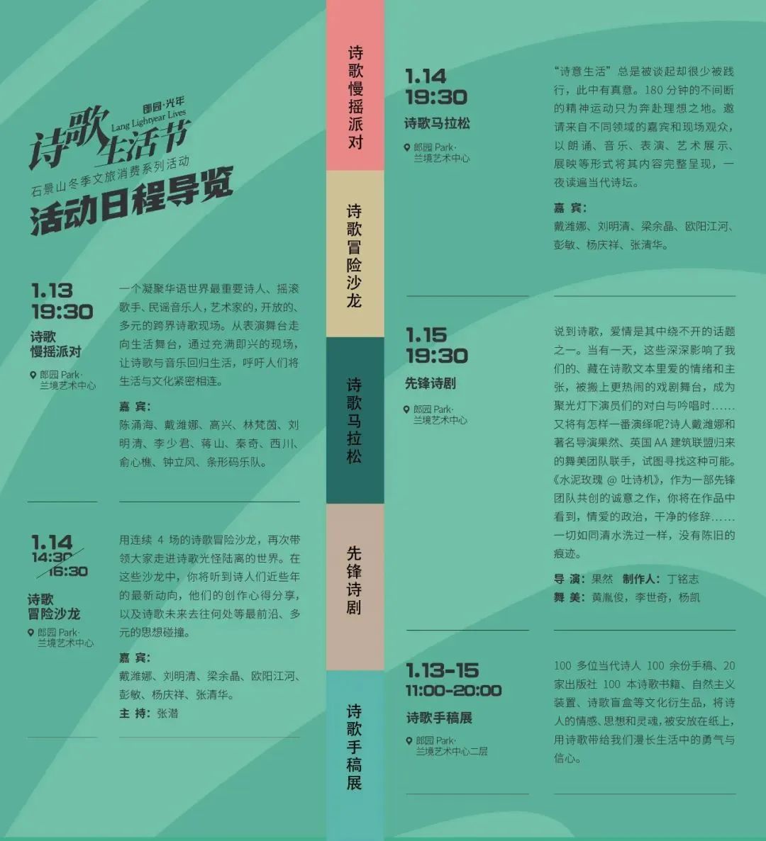 诗歌生活节在郎园Park兰境艺术中心举办,设置了光年诗歌慢摇派对、诗歌冒险沙龙、诗歌马拉松、诗剧现场、诗歌手稿展及诗歌专题展等系列活动单元,让大家通过文学建立心灵的链接,让诗意开启美好生活的新篇章。