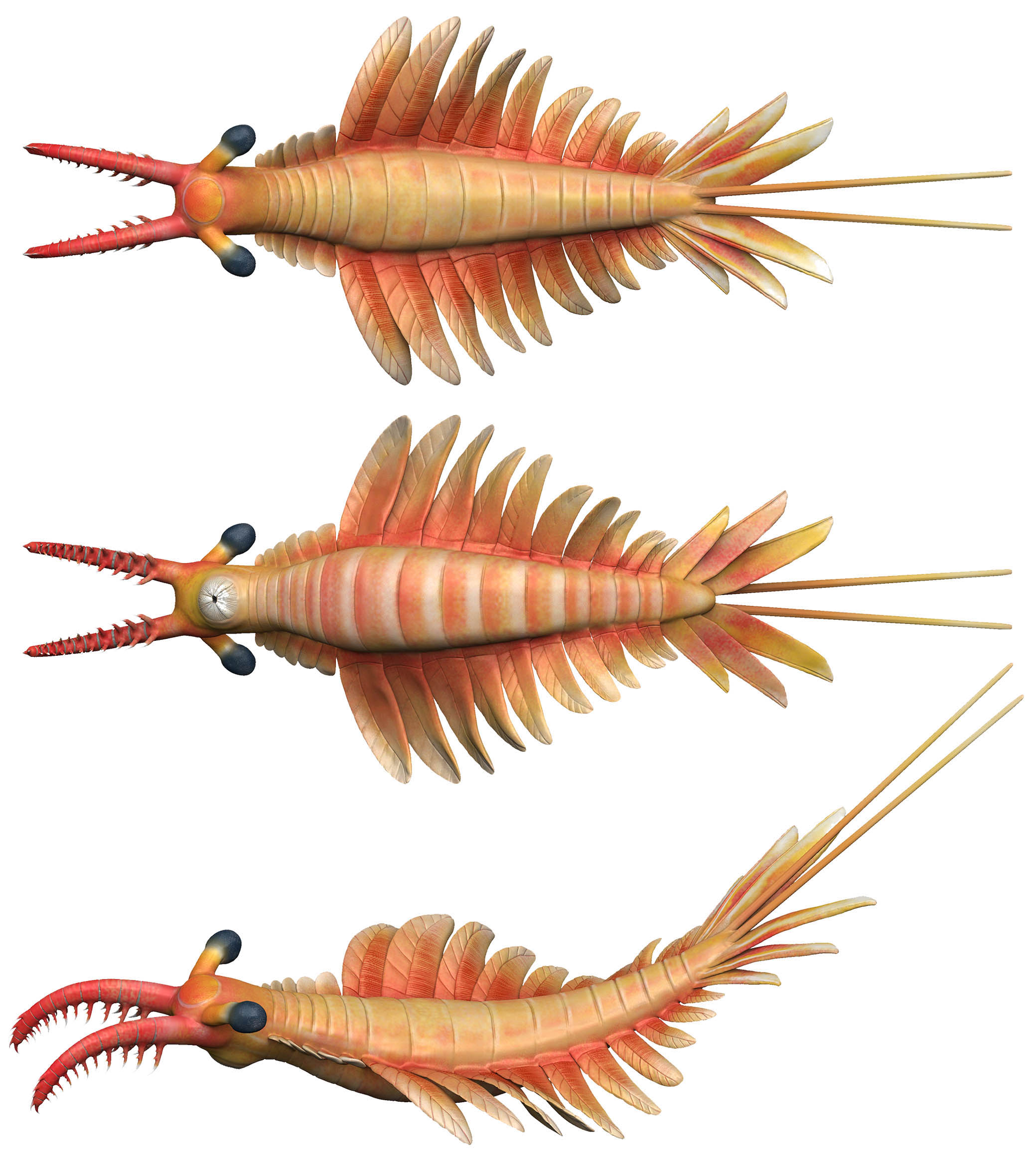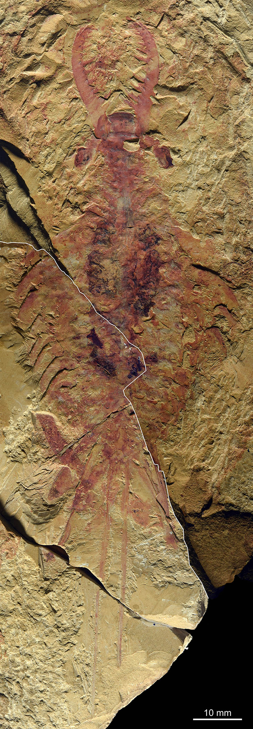研究团队对这块奇虾化石重新进行了精细的形态解剖研究。参与研究的中科院南古所副研究员曾晗介绍,跟其他奇虾相似,这只“明星奇虾”有着流线型的躯干,躯干上长着成对的桨状叶片和鳃片,用于游泳和呼吸。它的头部有一对多刺的钳子和一对大大的复眼。头部下方长着一只辐射状口器。十分特别的是,这只奇虾的尾部长着一对尤为细长的尾叉,前爪的形态细节也与其他奇虾明显不同。