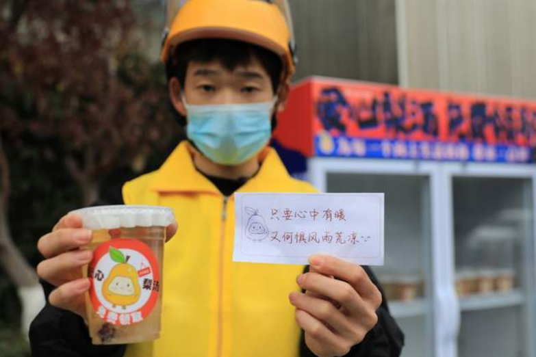 观看视频我们不难发现,领取梨汤的民众多为附近的环卫工人、外卖小哥及上下班的白领。两位路过打扫的环卫阿姨在领取梨汤后,念着梨汤上“永远记住,这个世界对你不‘梨’不弃”的俏皮话,忍不住相视一笑。而一名仍在咳嗽的外卖送餐员犹豫两次,最终拿起了一杯梨汤。看着梨汤上的字条,他一度哽咽,“这个城市需要我们,我不能倒下。梨汤上写了一句话,‘只要心中有暖,又何惧风雨荒凉’,让我感到非常温暖。让我在外地,觉得在这个城市里不是一个人。”