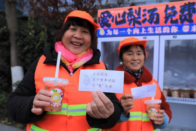 “永远记住,这个世界对你不‘梨’不弃”“只要心中有暖,又何惧风雨荒凉”“语文老师说,永远不要放弃生活”……近日,杭州街头出现了一批无接触“爱心梨汤”,路人不仅可以免费领取,还能收获一张手写着鼓励话语的小纸条,诸如“加油!一切都会好起来的”的暖心句子让无数市民动容。